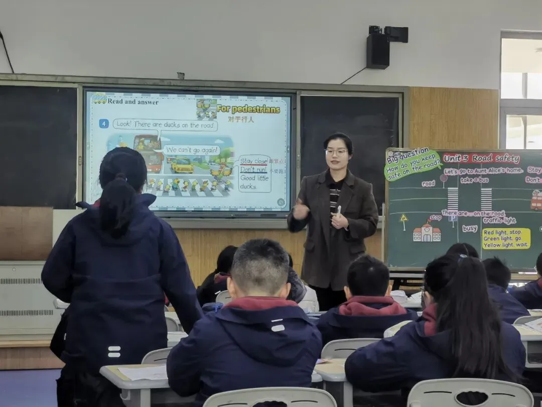 在四年级会场,来自我校的滕志颖老师执教了译林版英语四年级下册 Unit 3 Road safety 第一课时。课堂伊始,滕老师以贴近学生生活的交通场景导入,通过生动的图片与简短的提问,引导学生初步感知“道路安全”这一主题,激活已有生活经验。随后,学生借助动画视频整体感知课文内容,在层层递进的听、说、读、演活动中,逐步掌握“traffic light, road, busy”等核心词汇以及“There are…”“Let’s go to…”等句型。教学中,滕老师注重情境的真实性与任务的层次性,设计了角色扮演、情境判断、小组讨论等多样化活动,引导学生在卡通环节的情境中理解并运用安全规则,既提升了语言运用能力,也强化了规则意识与自我保护意识。整堂课紧扣教材,又适度拓展,将知识学习与生活实践有机融合,展现了扎实的教学功底与对新教材的深入解读。