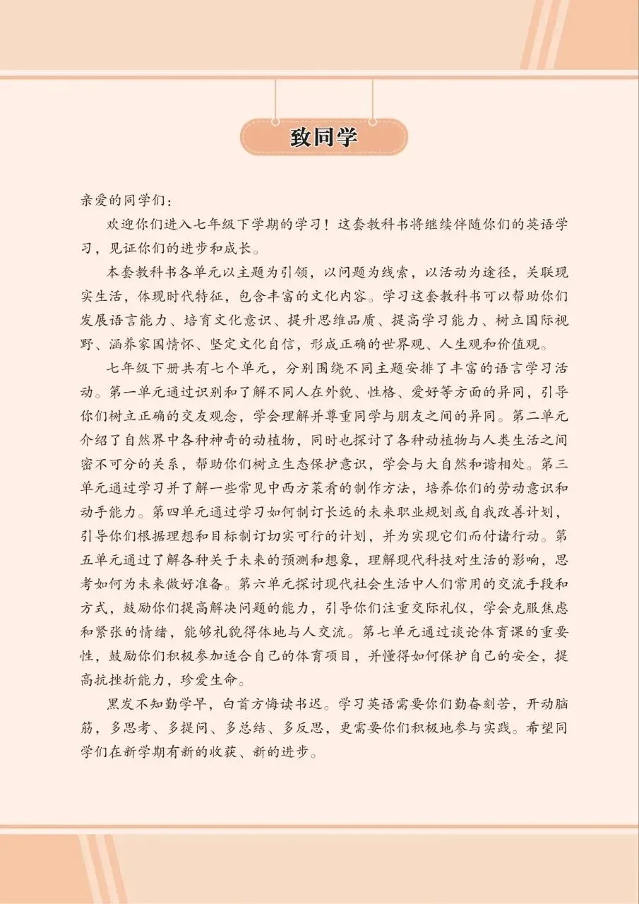 您看,这是教材中的致同学,写得太好了。“黑发不知勤学早,白首方悔读书迟。学习英语需要你们勤奋刻苦,开动脑筋,多思考、多提问、多总结、多反思,更需要你们积极地参与实践。”