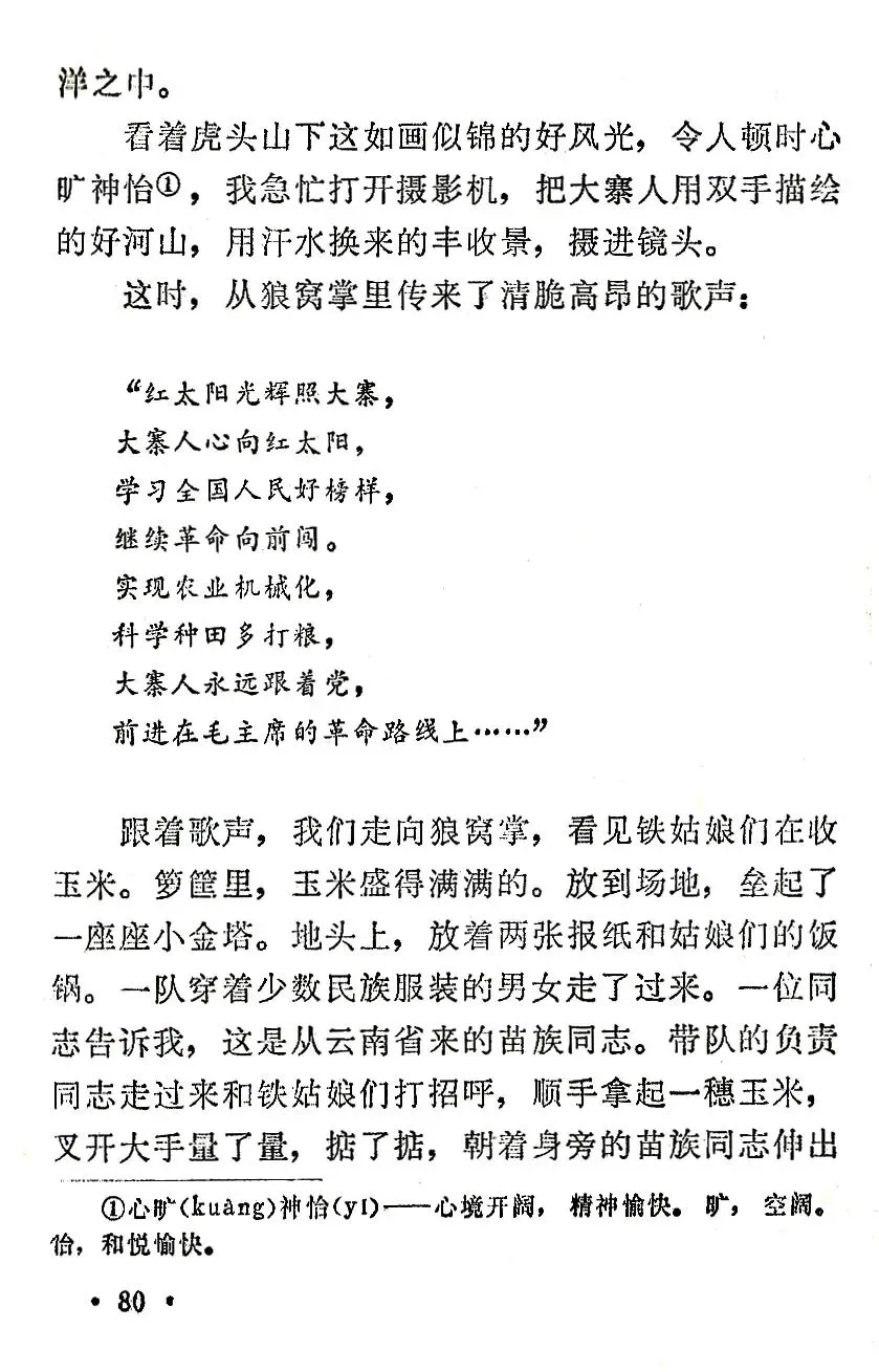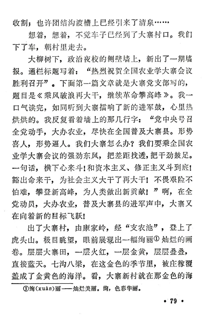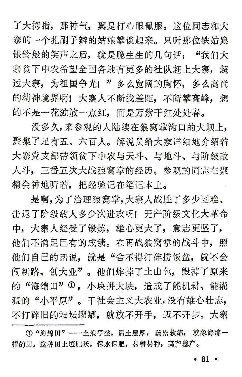 境界新。“我们大寨贫下中农希望全国各地有更多的社队赶上大寨,超过大寨,为国争光”。地块新。“小块拼大块,造成能机耕、能灌溉的‘小平原’”。……