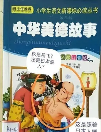 图中封面这人按说是民族英雄岳飞,结果一瞅,这发型、这背后的刀痕和袍子,怎么看怎么像日本浪人,小时候我们谁不背“精忠报国”这四个字,现在插画连民族气质都画丢了,好容易有个榜样也变了样子,左邻右舍都说,“小孩认岳飞可全靠后背那四个字,要不真认不出来。”