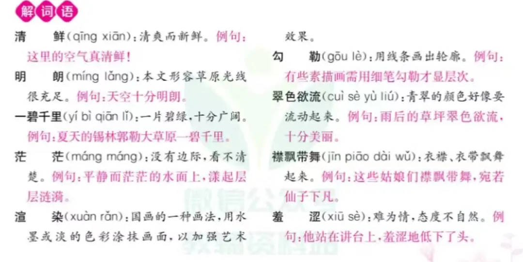 ④看看“解词语”部分有没有不知道意思的词语,有的话给孩子解释一下,给出例句并引导造句;