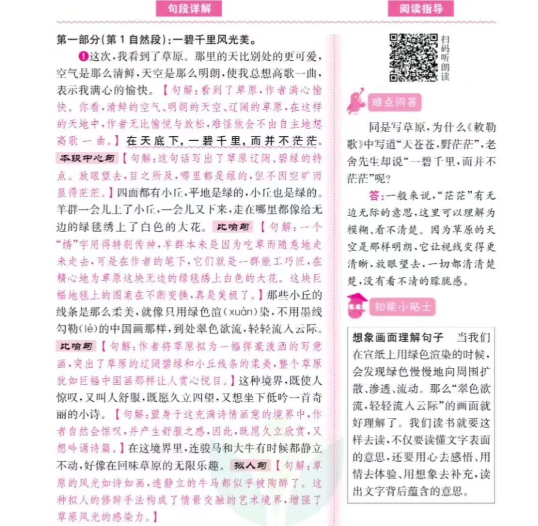 ②带着孩子按照语文详解上的课文注解一句句地学习。这个过程是亲子互动的过程,和孩子一起读,家长提问,孩子回答,引导孩子思考,大家一起讨论。这个过程会涉及到词句理解、句段作用、人物形象概括、段落大意概括、中心思想揣摩的过程。