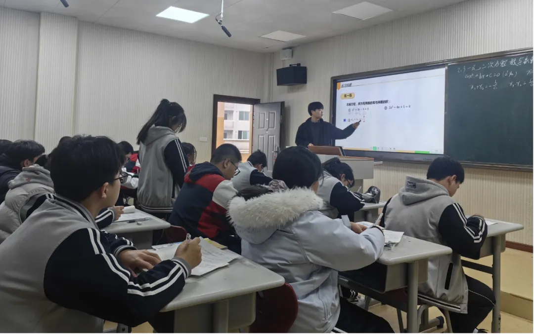 高湖镇初级中学陈家铭老师带来示范课《2.3一元二次方程根与系数的关系》。陈老师通过三个典型的一元二次方程入手,组织学生观察具体的一元二次方程的根与系数的关系,归纳出规律,两根与系数之间的关系。引导学生运用根与系数的关系解决简单问题,体会化归思想,发展运算能力和应用意识。
