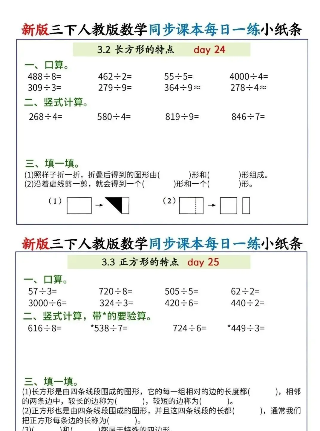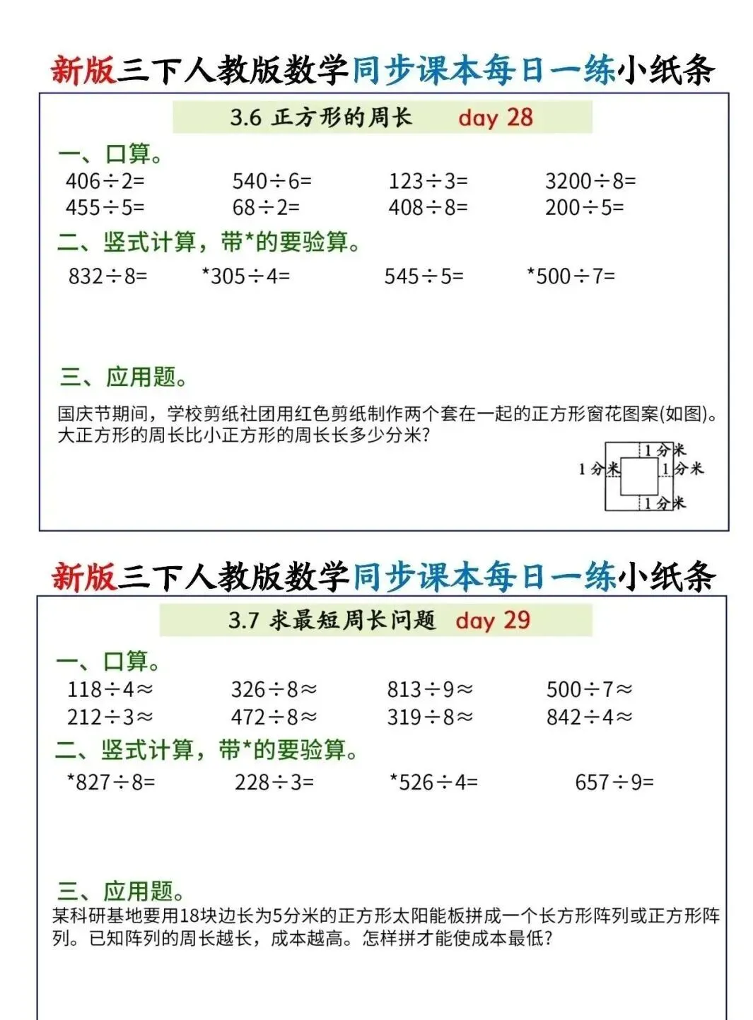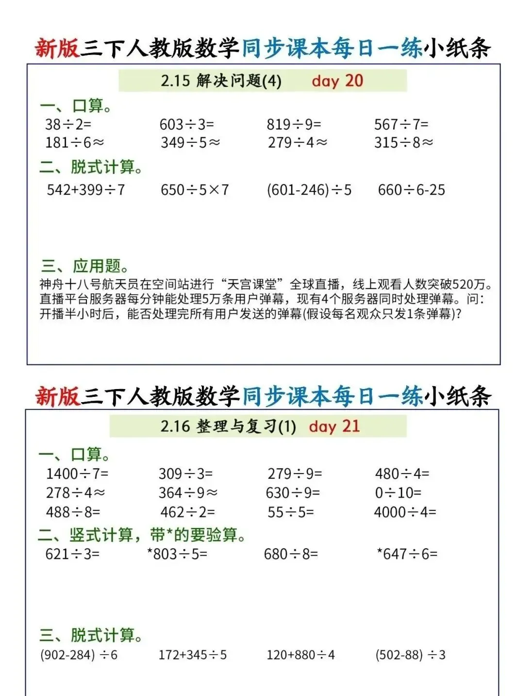 2026小学数学三年级下册《同步课本每日一练》小纸条(含答案)人教版|可下载打印