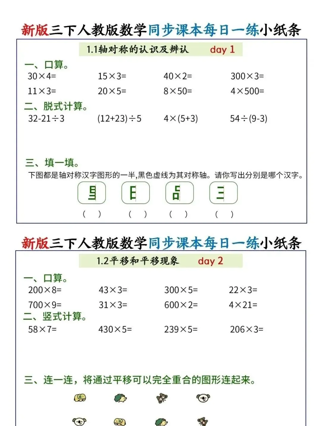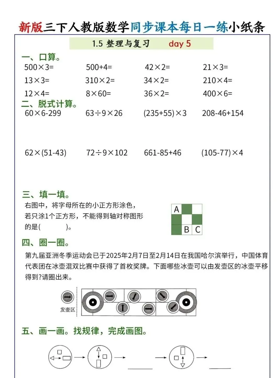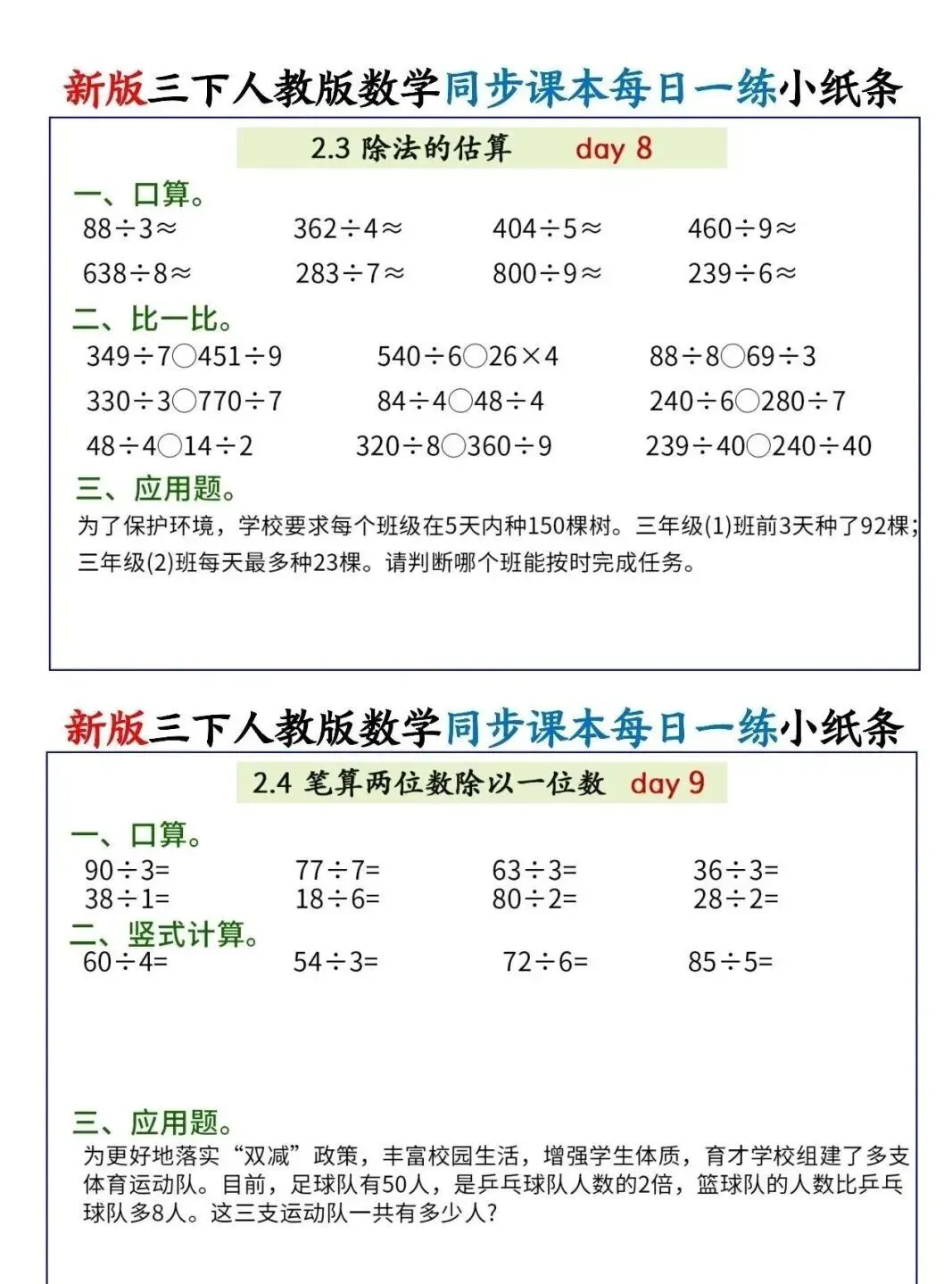 2026小学数学三年级下册《同步课本每日一练》小纸条(含答案)人教版|可下载打印