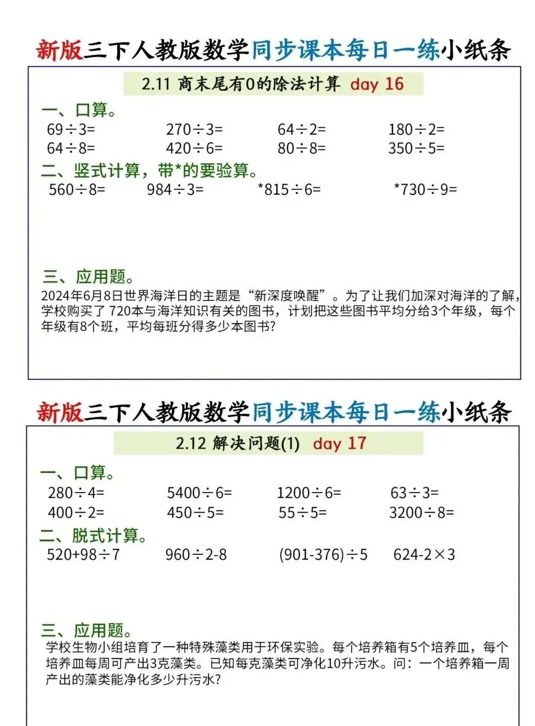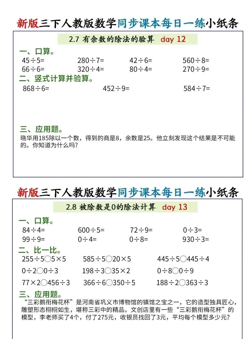 >2026小学数学三年级下册《同步课本每日一练》小纸条(含答案)人教版|可下载打印