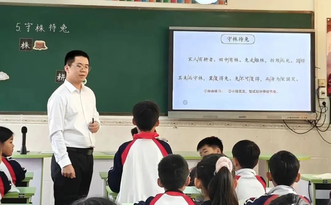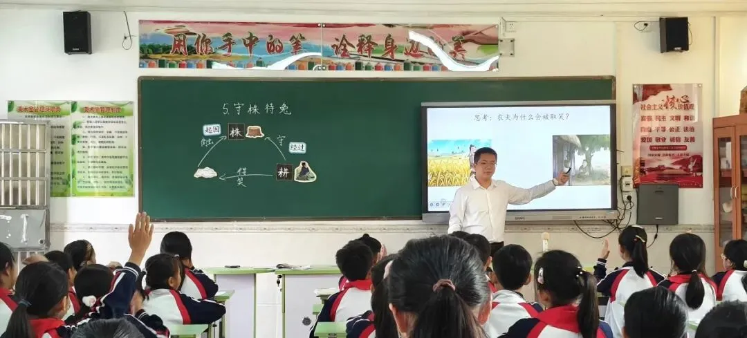 上午,活动在两位海珠区到丰顺支教老师带来的两节高质量研讨课中拉开序幕。在潭江中心小学支教的教师陈佰权,执教三年级下册文言文《守株待兔》第一课时。陈老师紧扣“读寓言,明道理”的语文要素,以“漫游寓言世界,我是智慧讲解员”为任务驱动,通过情境创设、朗读指导、文意梳理、道理探究等环节,引导学生读懂故事、感悟寓意,将AI技术与“教学评一体化”深度融合,有效突破文言文教学重难点。