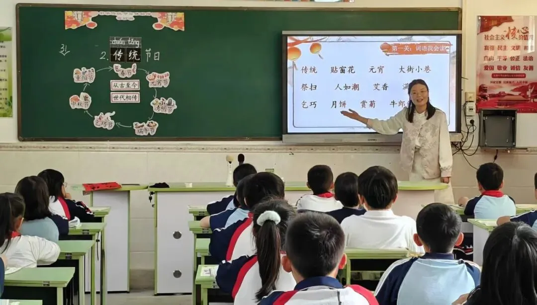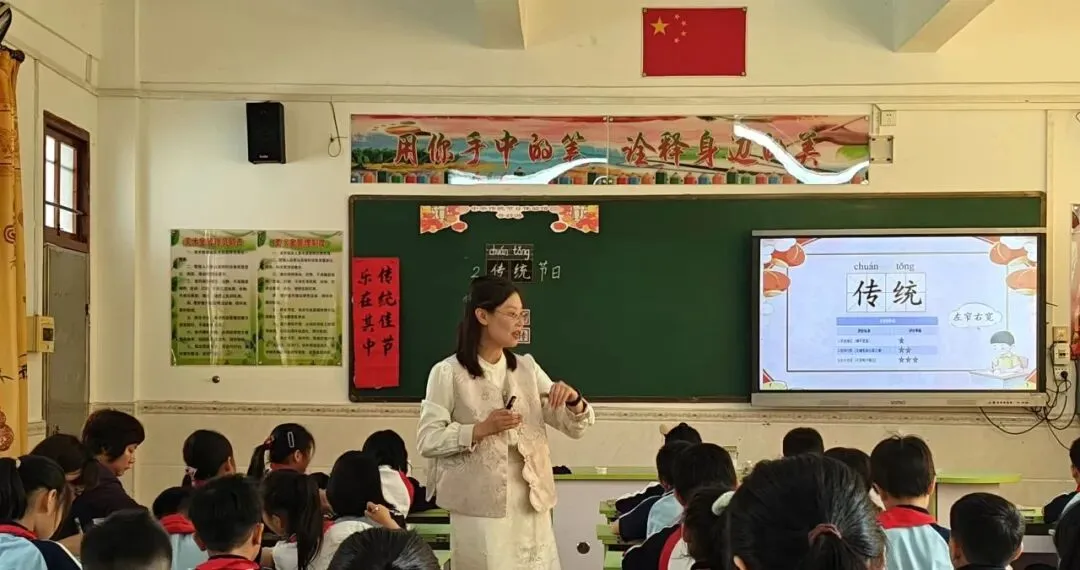 随后,在汤西中心小学支教的马凤姬老师带来二年级下册《传统节日》课例。马老师以“中华传统节日体验馆奇妙游”为情境,巧用字谜、字理、形声字规律等多种识字方法,带领学生在趣味闯关中学汉字、理顺序、品习俗,将识字教学与传统文化浸润有机结合,课堂生动活泼、童趣盎然。