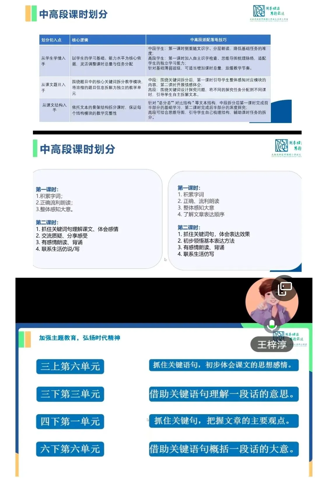 5.培训提供了三种课时划分切入点及落地技巧:从学生学情入手:以学生学习基础为核心,中段侧重随文识字、分层朗读,降低基础任务难度;高段加入自主识字检查、思维导图梳理,适配独立学习能力,基础薄弱班级可适当增加课时;从课文题目入手:围绕题目核心关键词拆分教学模块,中段引导学生整体感知模块内容,高段设计探究问题,引导学生自主拆解文本;从课文结构入手:依托文本骨架结构拆分课时,保证每个结构模块教学完整性,中段分课时完成基础学习与深度探究,高段结合思维导图辅助任务拆分。