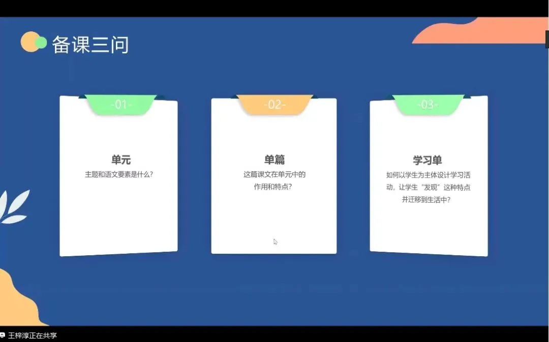 王梓淳老师提出“备课三问”,引导教师精准把握教学方向:1.单元层面:单元主题和语文要素是什么?