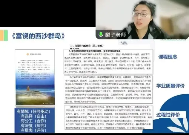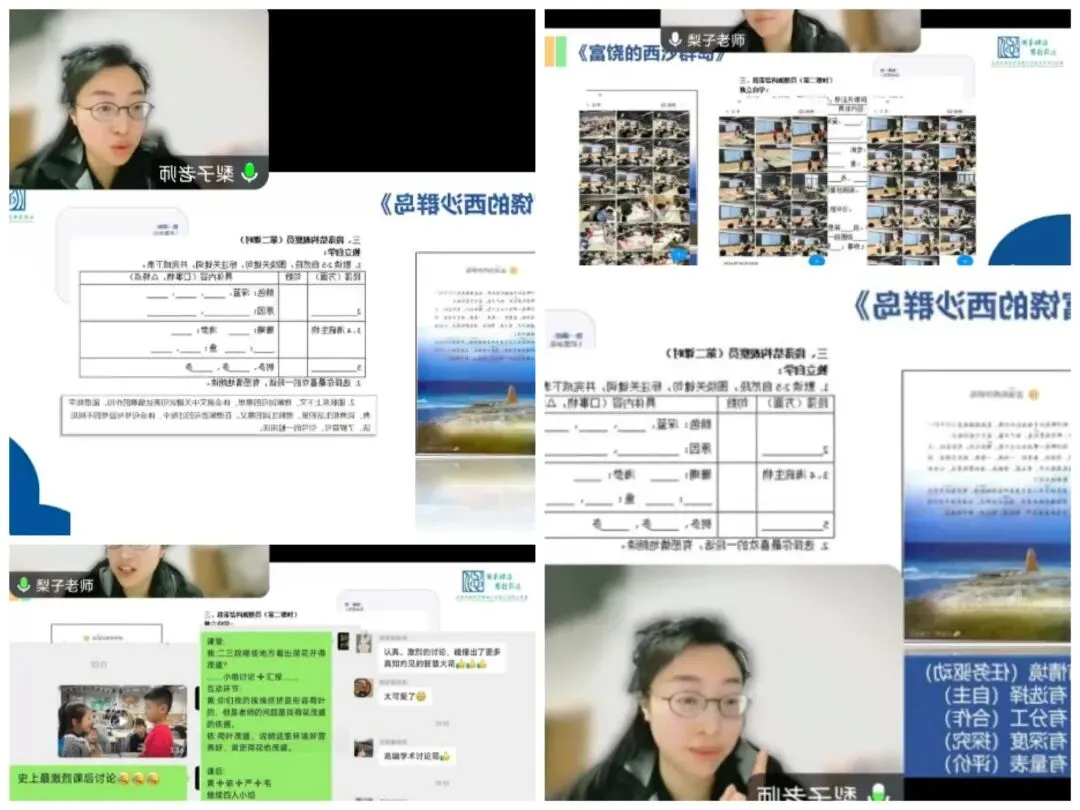 接着,黎晓老师以《富饶的西沙群岛》具体事例为我们深入剖析学习三问中学习单设计 第一课时:积累字词、正确流利朗读、整体感知大意(高段可增加了解文章表达顺序) 第二课时:抓住关键语句理解课文/体会表达效果、交流质疑、有感情朗读背诵、联系生活仿写/说写。老师们积极互动。