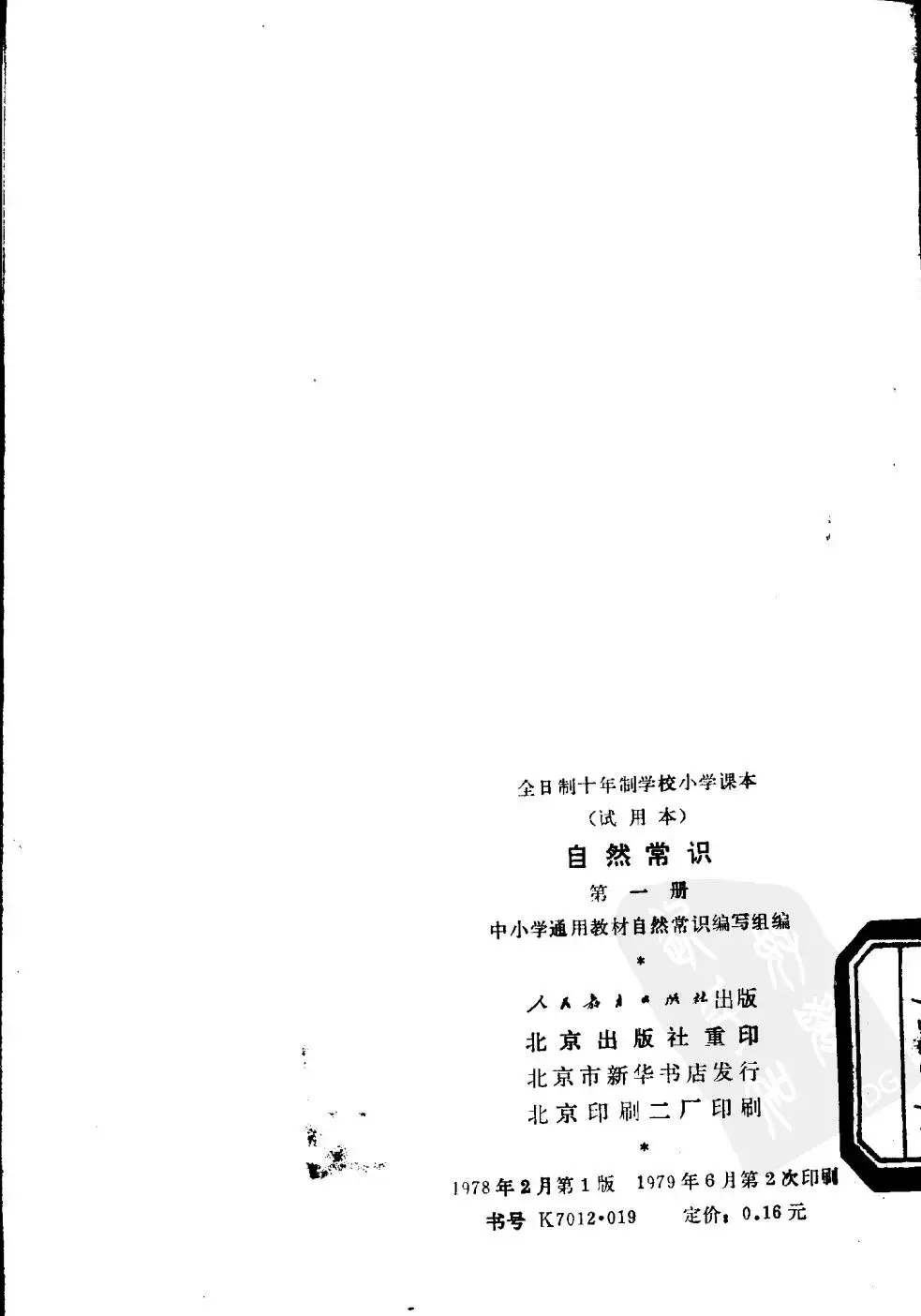 1978年小学课本《自然常识》第一册