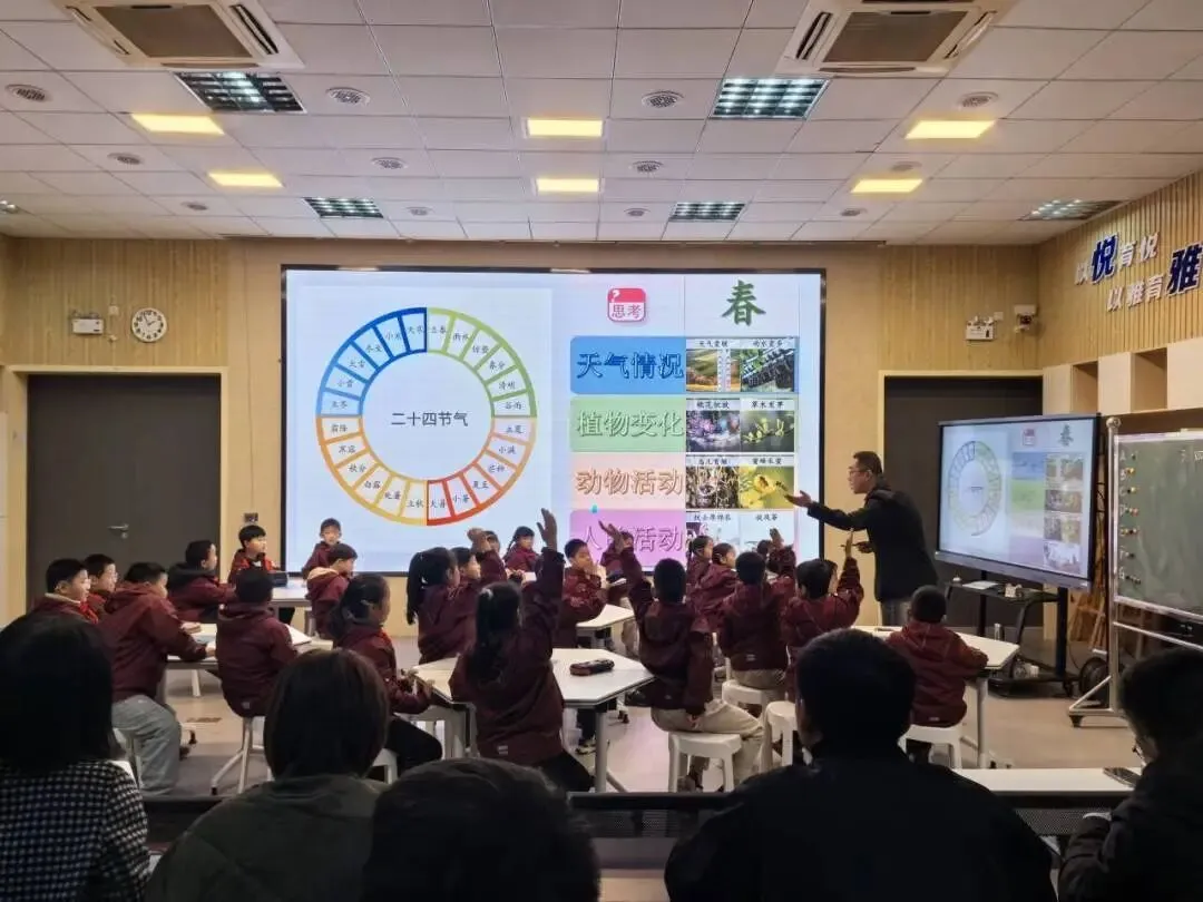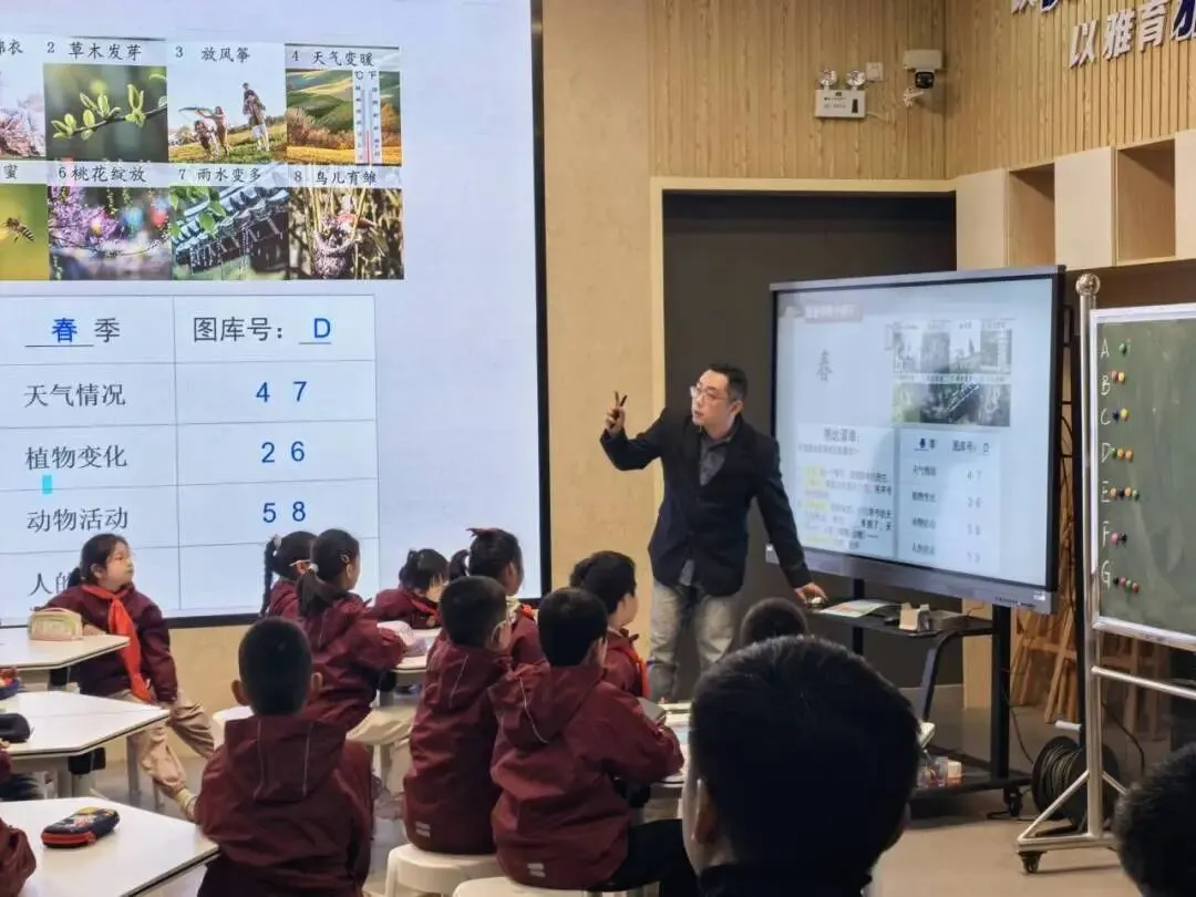 活动中,月牙湖小学王子旋副校长执教《四季的天气》。课上,王校长立足二年级学生认知特点,设计四季图片分类、二十四节气歌共读等沉浸式体验活动,引导学生从单日天气认知延伸至季节变化规律探索,体会二十四节气的科学文化价值,让学生在观察、交流中建立对天气的系统认知,扎实落实单元“认知、探究、生活”三大逻辑。
