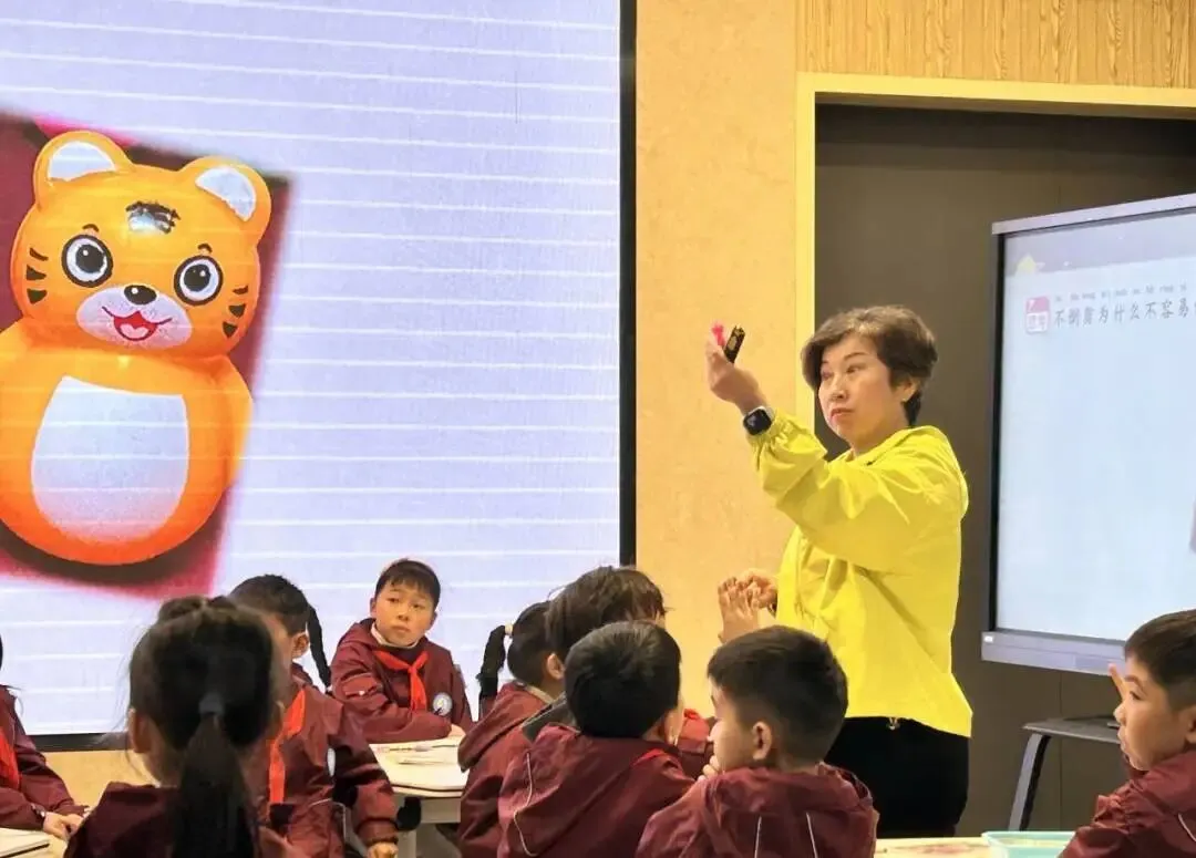 府西街小学马亚莉副校长带来《不倒翁立起来》一课,以“玩—猜—拆—做”策略贯穿课堂。从猜想不倒翁秘诀,到拆解观察、开展有球与无球对比实验、纸鹦鹉配重迁移实验,层层引导学生理解“重心越低、稳定性越好”的原理,让学生在动手探究中培养假设、验证的科学思维,实现从“玩耍者”到“探究者”的转变。