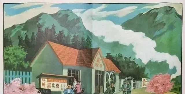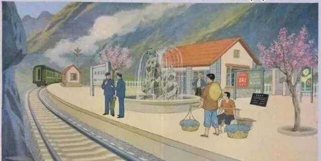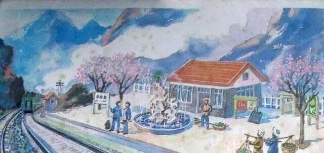 图里的小站不大,顶上铺着红瓦,门口两丛粉杏花开得正好,一层一层绕着白栅栏,后头是连绵的山,全是绿色的,没有乌压压的热闹,也没有后来景区那种摆拍的味道,站里站外总共三五个人安安静静,没人大喊大叫,慢慢腾腾的日头洒在院子里,喷泉冒着水,豹子似的火车头一眨眼就过去,脚下铁轨顺着山弯慢慢拉远,那时候从没见过真的火车站,只觉得这地方安耳朵又安心,课文里写的“慢车才停两三分钟”,快车一下就过去了,就是这种小地方最容易让人放松。
