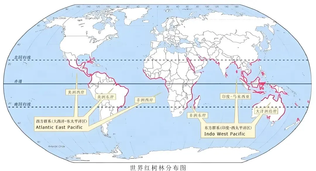 从世界分布来看,红树林主要分布在热带、亚热带海岸潮间带,集中在东南亚、非洲西海岸、美洲加勒比海等地区,我国的红树林属于北半球分布的北缘。