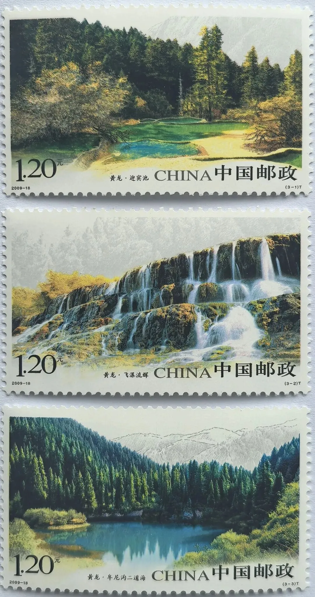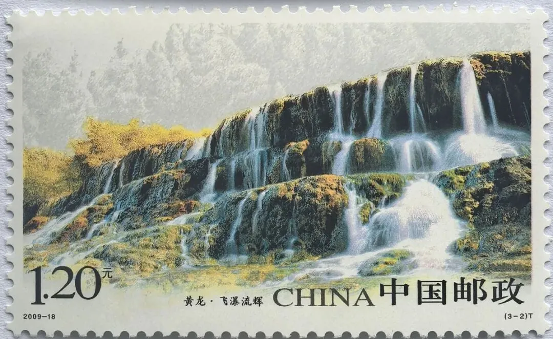 这套邮票的设计将它的美展现得淋漓尽致,展现了黄龙自然遗产的典型特征。