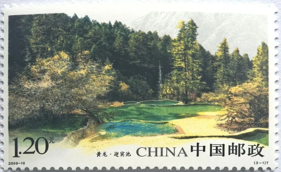这枚邮票的图案是进入黄龙景区后首先看到的一组彩池群-迎宾池。