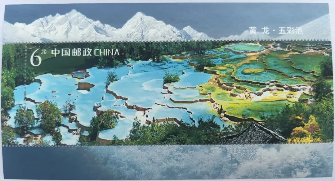 这枚小型张是黄龙景区的核心景点-五彩池。