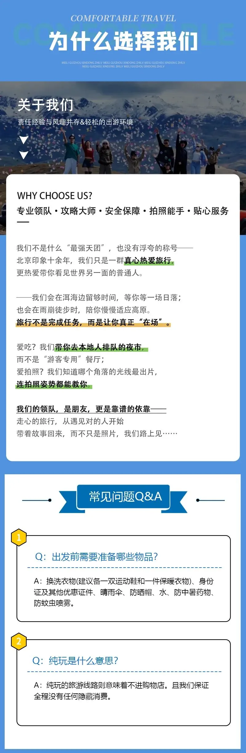 1)活动出发前会统一给大家发集合信息(微信或短信),包括领队电话、集合时间地点、车牌号等活动信息,队员请以集合信息为准准时集合;车上座位顺序为集合时先到自由选择,全程原车原位;迟到视为自动放弃后续行程,请恕费用不退。