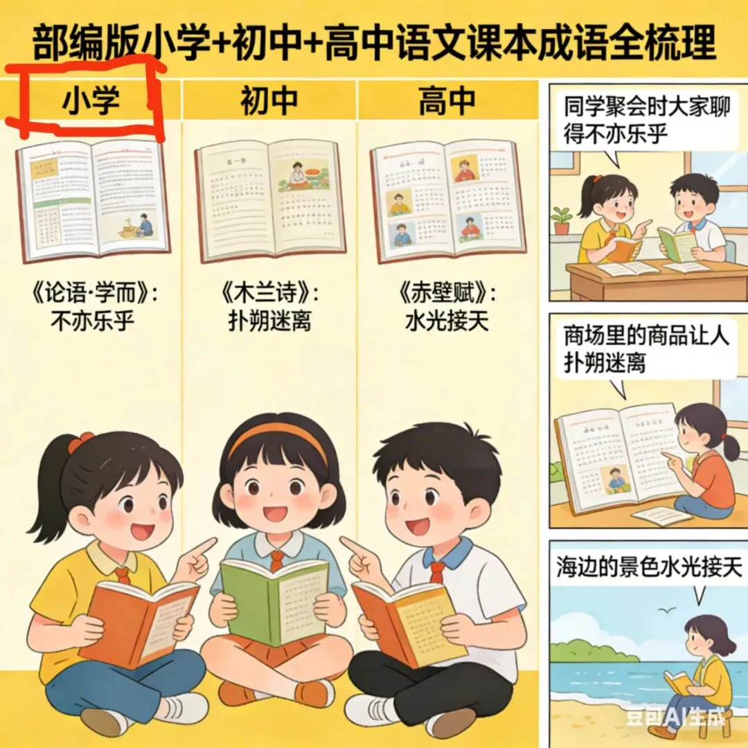 本资料已完整覆盖部编版小学1-6年级、初中7-9年级、高中必修+选择性必修全学段课内核心成语,严格按年级、分册、课文梳理,标注精准文体与典籍出处,全程剔除重复内容,排版规整划一,兼顾日常积累、课堂教学、小升初、中考、高考全阶段备考需求,格式清晰,可直接复制打印、分学段拆分使用,实用性拉满。