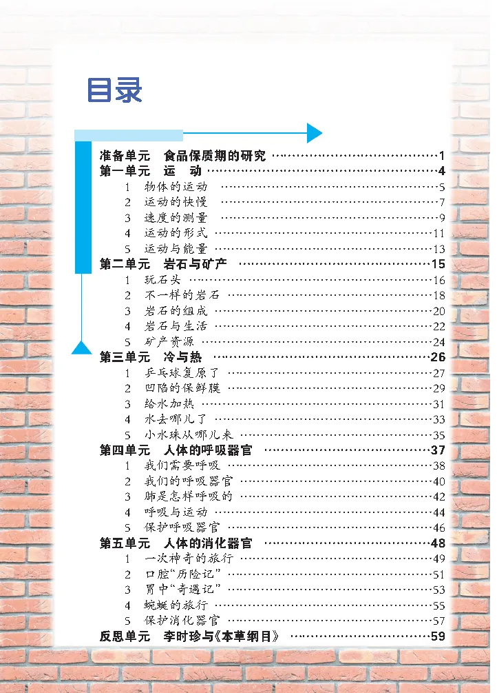 ,然后发送 电子课本 四年级科学进阶关键期!2026秋大象社版四年级科学上册新教材,紧扣2022版义务教育科学课程标准,以“探究式学习”为核心,编排8个单元(含1个准备单元+5个主题单元+1个反思单元+1个复习单元),贴合四年级学生从启蒙向进阶过渡的认知特点,以趣味实验、动手操作和生活探究为主,注重培养科学思维和探究能力,衔接小学中段科学核心考点,为后续科学学习筑牢基础,孩子预习、复习、动手实验直接对照,不用费心整理,轻松吃透全单元核心知识点。全单元核心知识点精准拆解,结合教材真实单元目录梳理,适配课堂考点与探究学习:准备单元《食品保质期的研究》,引导学生掌握科学探究的基本过程,学会观察食品包装上的保质期、生产日期等关键信息,通过对比实验探究储存条件对食品保质期的影响,了解密封、低温等延长食品保质期的方法,树立食品安全意识。5个主题单元依次为《运动》《岩石与矿产》《冷与热》《人体的呼吸器官》《人体的消化器官》,搭配反思单元《李时珍与〈本草纲目〉》和复习单元串联全册知识。《运动》单元重点探究物体运动的状态,认识参照物、理解运动的相对性,学会描述物体运动快慢,掌握速度的简单计算,区分直线运动、曲线运动等常见运动形式,了解运动与能量的关系,通过小车运动实验加深理解。《岩石与矿产》单元引导学生观察岩石的颜色、形状、手感等特征,了解岩石的分类和形成,认识矿产的用途,树立保护矿产资源的环保意识,可动手制作石头标本盒,提升观察能力。《冷与热》单元聚焦温度变化和热传递,学会使用温度计测量温度,探究热胀冷缩现象,认识传导、对流、辐射三种热传递方式,结合生活实例理解冷与热的应用。《人体的呼吸器官》和《人体的消化器官》单元,分别认识人体呼吸、消化系统的组成及功能,了解呼吸和消化的基本过程,学会保护呼吸和消化器官的方法,养成健康的生活习惯。反思单元通过了解李时珍编撰《本草纲目》的事迹,学习科学家坚持不懈的探究精神,培养严谨的科学态度。