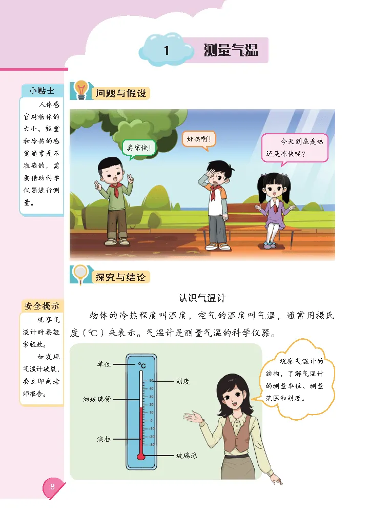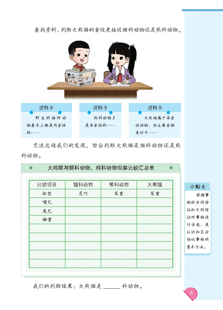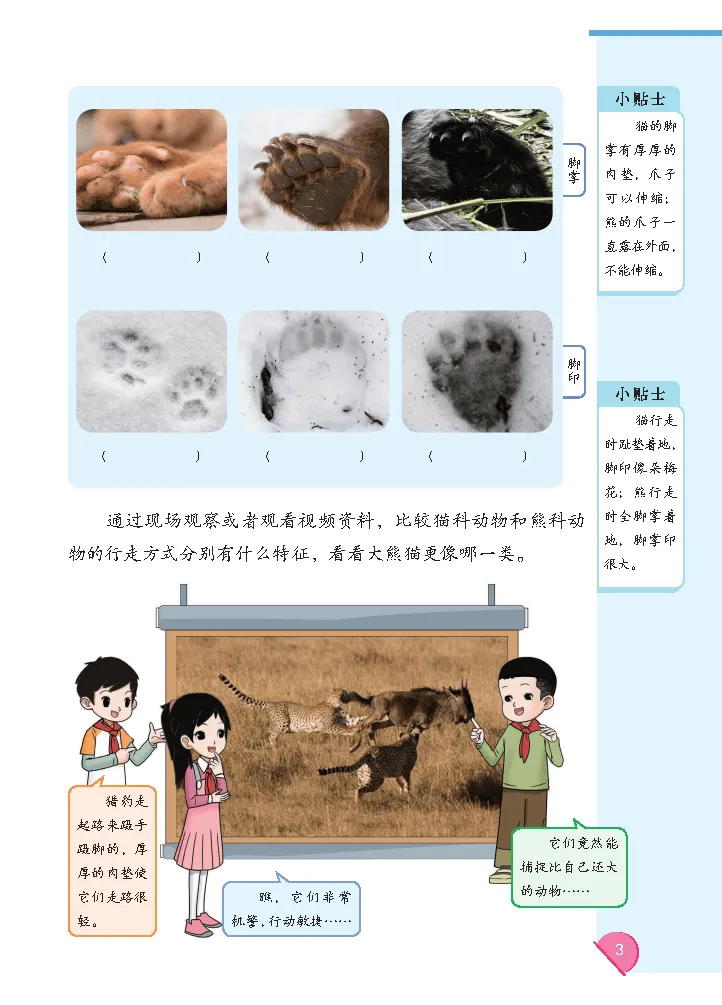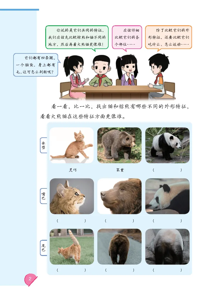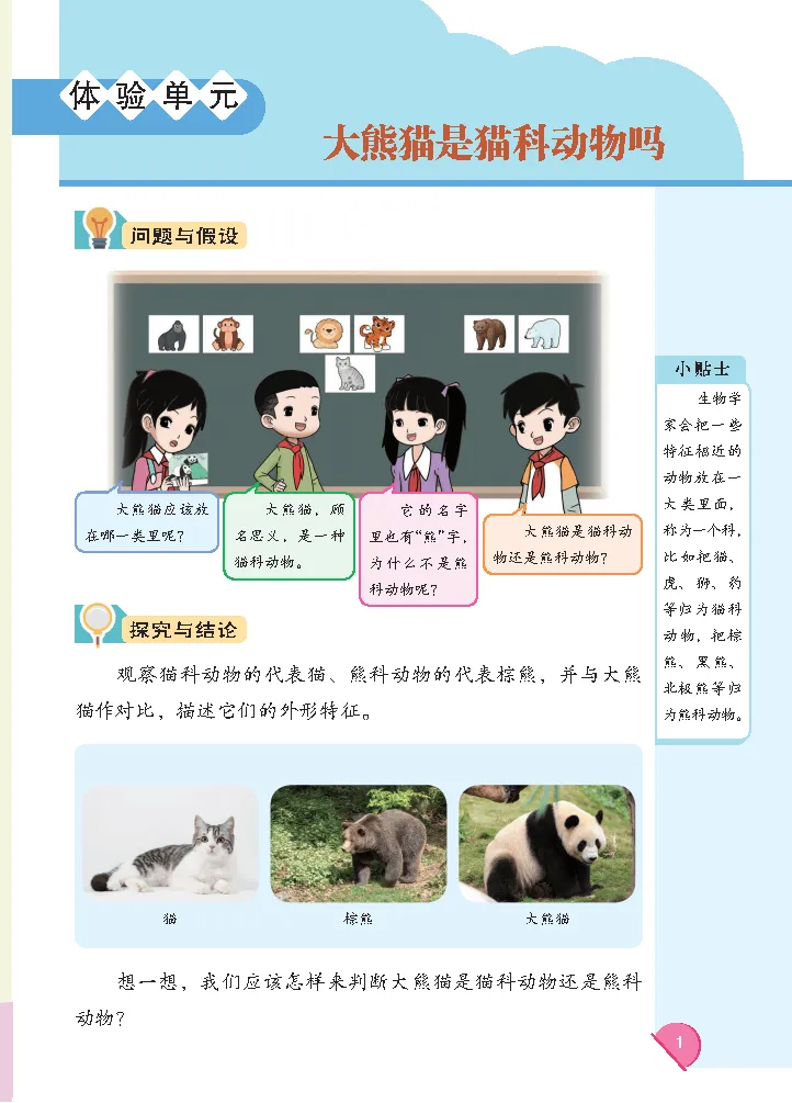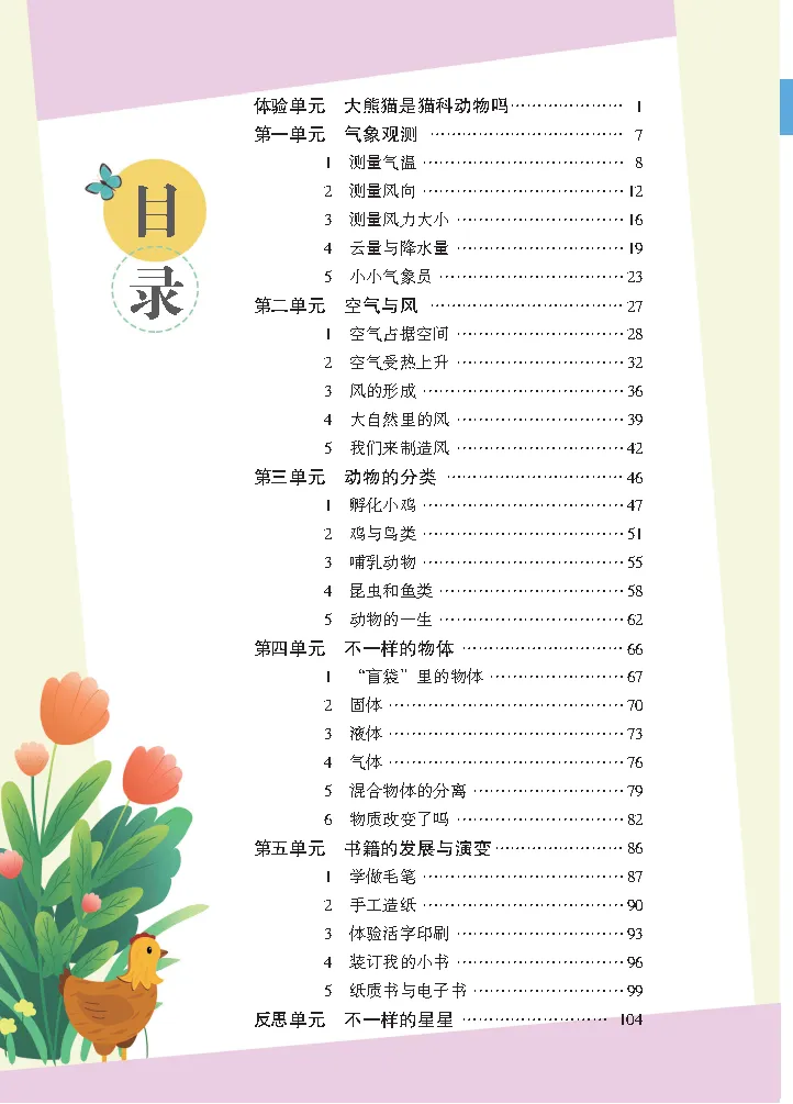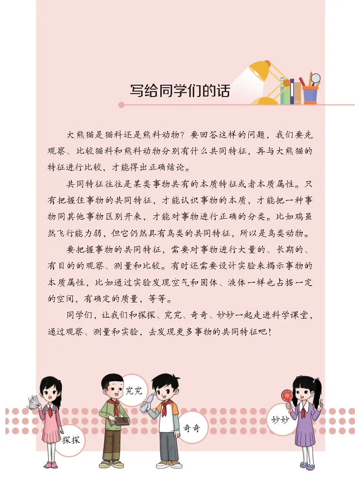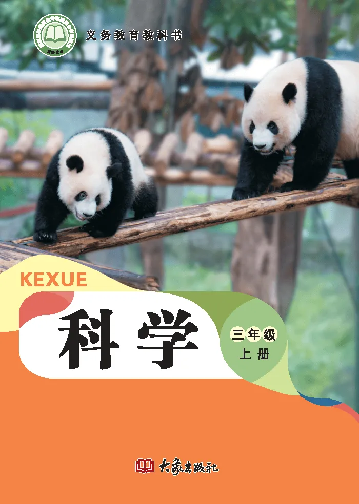 ,然后发送 电子课本 三年级科学启蒙关键期!2026秋大象社版三年级科学上册新教材,紧扣2022版义务教育科学课程标准,以“探究式学习”为核心,编排8个单元(含1个体验单元+5个主题单元+1个反思单元+1个复习单元),贴合三年级学生零基础启蒙的认知特点,以趣味实验、动手操作和生活探究为主,规避抽象难懂的知识点,注重培养科学思维和探究能力,为后续初中理化学习奠定基础,孩子预习、复习、动手实验直接对照,不用费心整理,轻松吃透全单元核心知识点。全单元核心知识点精准拆解,结合教材真实单元目录梳理,适配课堂考点与启蒙探究:体验单元《大熊猫是猫科动物吗》,引导学生通过观察、对比大熊猫与猫科动物的特征,学会基于核心生理特征给动物分类,明确大熊猫属于食肉目熊科,而非猫科,培养科学探究的严谨性,同时掌握判断动物类别的基本方法,了解大熊猫胎生哺乳的哺乳动物典型特征,知道其主要食物是竹子。5个主题单元依次为《气象观测》《空气与风》《动物的分类》《不一样的物体》《书籍的发展与演变》,搭配反思单元《不一样的星星》和复习单元串联全册知识。核心知识点涵盖:气象观测单元重点学习测量气温、风向、风力和降水量,认识气温计、风向标、风力计、雨量器等工具,掌握规范使用方法,学会制作简易气象工具,解读天气信息,区分晴天、多云、阴天,了解一天中气温先上升后下降的变化规律,还能根据户外物体状态估测风力大小。空气与风单元探究空气占据空间、空气受热上升的特点,理解风的形成原因(热空气上升、冷空气补充),能动手制造风,尝试自制简易风车、孔明灯(注意安全),感受空气的存在与作用,明白厨房里的排风口设在高处的科学原理。动物的分类单元学习孵化小鸡的相关知识,区分鸡与鸟类的特征,掌握哺乳动物、昆虫和鱼类的核心特点,了解动物的一生,知道胎生、卵生的区别,树立保护珍稀动物的意识。不一样的物体单元通过“盲袋”游戏区分固体、液体、气体的差异,学习混合物体的分离方法,观察物质的变化,了解高锰酸钾等物质的溶解特点,掌握加快溶解的方法。书籍的发展与演变单元体验学做毛笔、手工造纸、活字印刷等活动,了解书籍的演变历程,感受古代劳动人民的智慧,区分纸质书与电子书的差异。每个单元都配套简易动手实验,注重“做中学”,贴合三年级科学启蒙需求。
