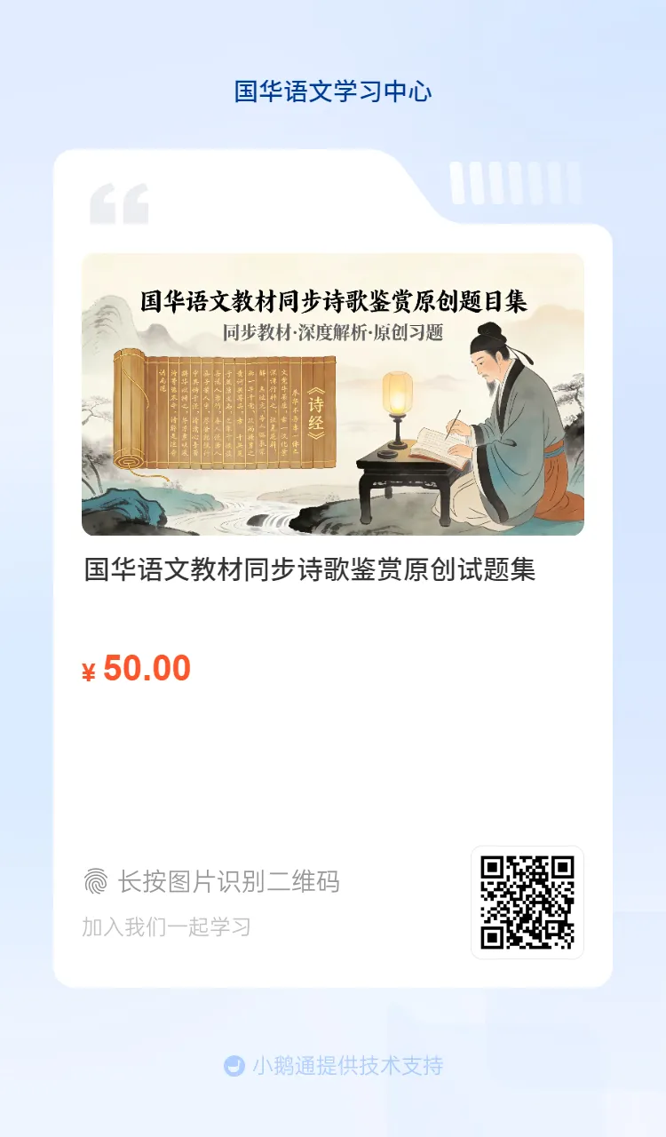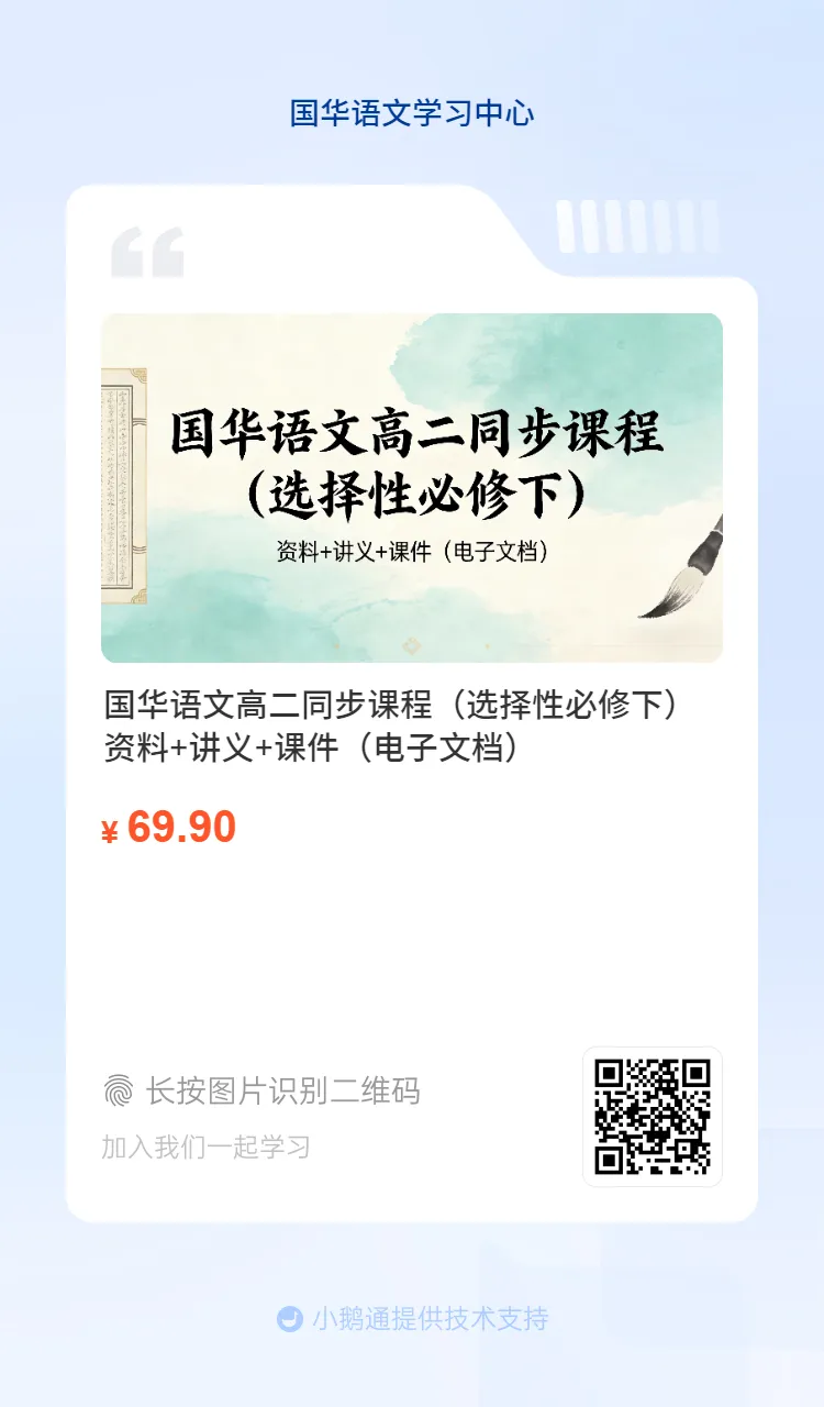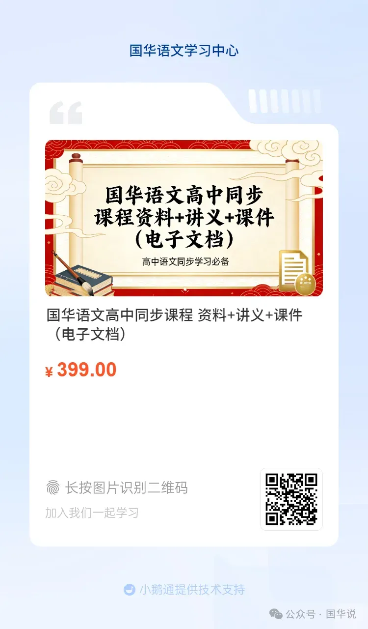 以上是我高中同步课程的部分内容和课程讲义,题目也是我原创命题,国华语文高中同步课,既专注文本细读,又做足教考衔接,让语文课堂在回归语文味的同时,实用于高考,让教师教的轻松,学生学的有趣。想要加入语文研讨学习群,与天下同行同道共商语文的老师同学加微信qiaohuohua: