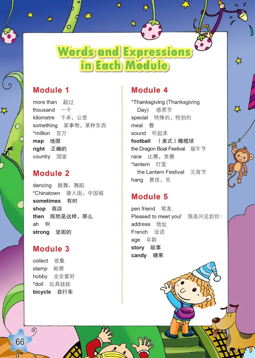 1、country /ˈkʌntri/ n. 国家2、map /mæp/ n. 地图3、capital /ˈkæpɪtl/ n. 首都4、city /ˈsɪti/ n. 城市5、river /ˈrɪvə(r)/ n. 河流6、mountain /ˈmaʊntən/ n. 山7、famous /ˈfeɪməs/ adj. 著名的8、visit /ˈvɪzɪt/ v. 参观9、travel /ˈtrævl/ v./n. 旅行10、holiday /ˈhɒlədeɪ/ n. 假期11、photo /ˈfəʊtəʊ/ n. 照片12、take photos /teɪk/ phr. 拍照13、east /iːst/ n. 东方14、west /west/ n. 西方15、north /nɔːθ/ n. 北方16、south /saʊθ/ n. 南方17、different /ˈdɪfrənt/ adj. 不同的18、language /ˈlæŋɡwɪdʒ/ n. 语言19、people /ˈpiːpl/ n. 人们20、culture /ˈkʌltʃə/ n. 文化21、delicious /dɪˈlɪʃəs/ adj. 美味的22、restaurant /ˈrestrɒnt/ n. 餐馆23、history /ˈhɪstri/ n. 历史24、museum /mjuˈziːəm/ n. 博物馆25、learn about /lɜːn/ phr. 了解26、write to /raɪt/ phr. 写信给27、send /send/ v. 寄送28、postcard /ˈpəʊstkɑːd/ n. 明信片29、welcome /ˈwelkəm/ v./n. 欢迎30、enjoy oneself /ɪnˈdʒɔɪ/ phr. 玩得开心