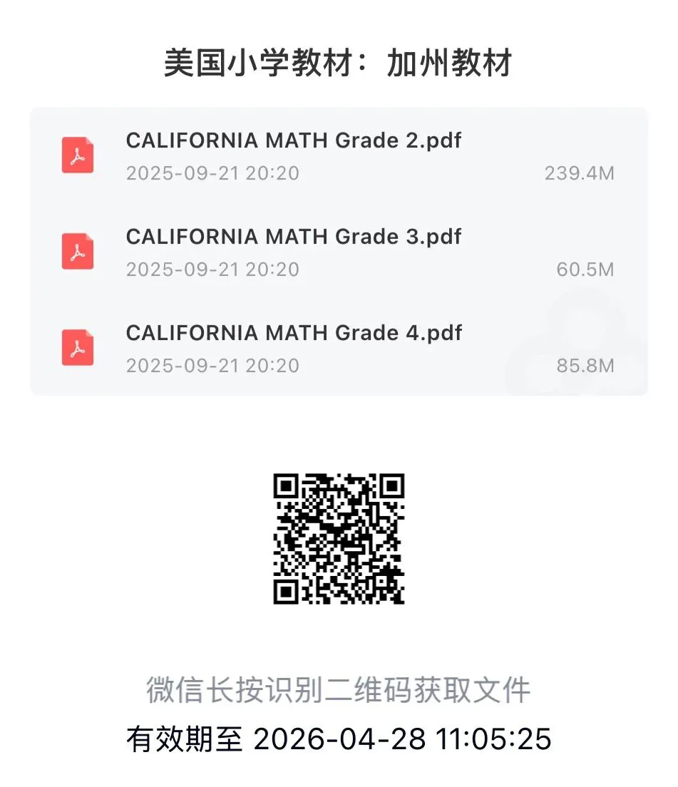 通过百度网盘分享的文件:美国小学教材:加...链接:https://pan.baidu.com/s/1OgF6UCnxcZ3z9HiSuwRQnQ?pwd=12go 复制这段内容打开「百度网盘APP 即可获取」