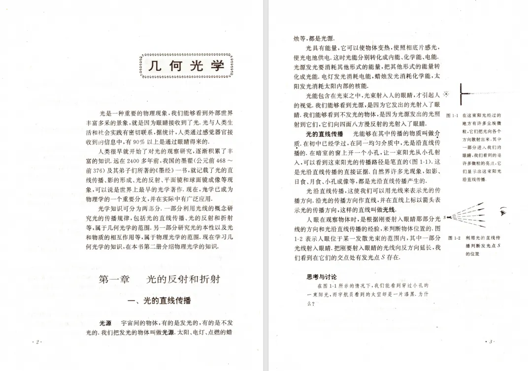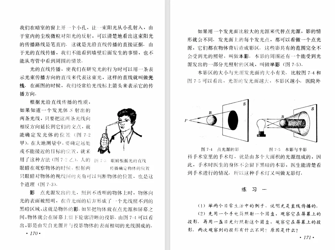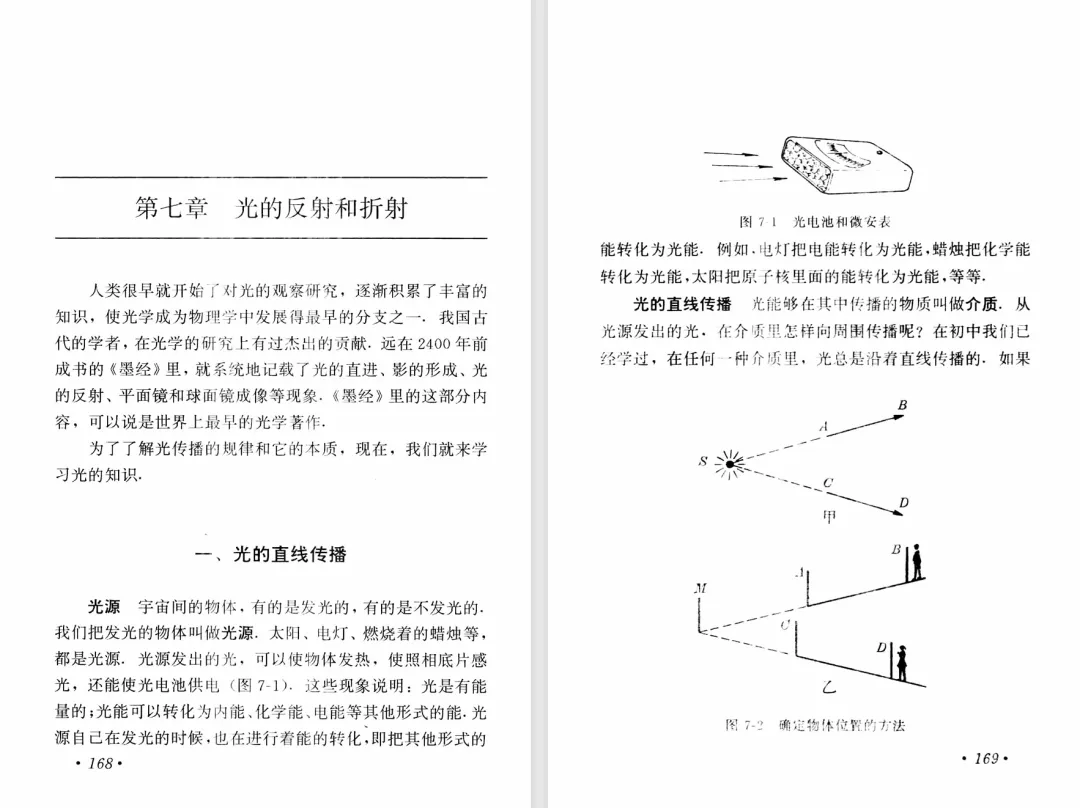 下面是九十年代高中物理必修第二册第七章介绍光的直线传播和光速的两个小节,乙种本和下面的内容接近。