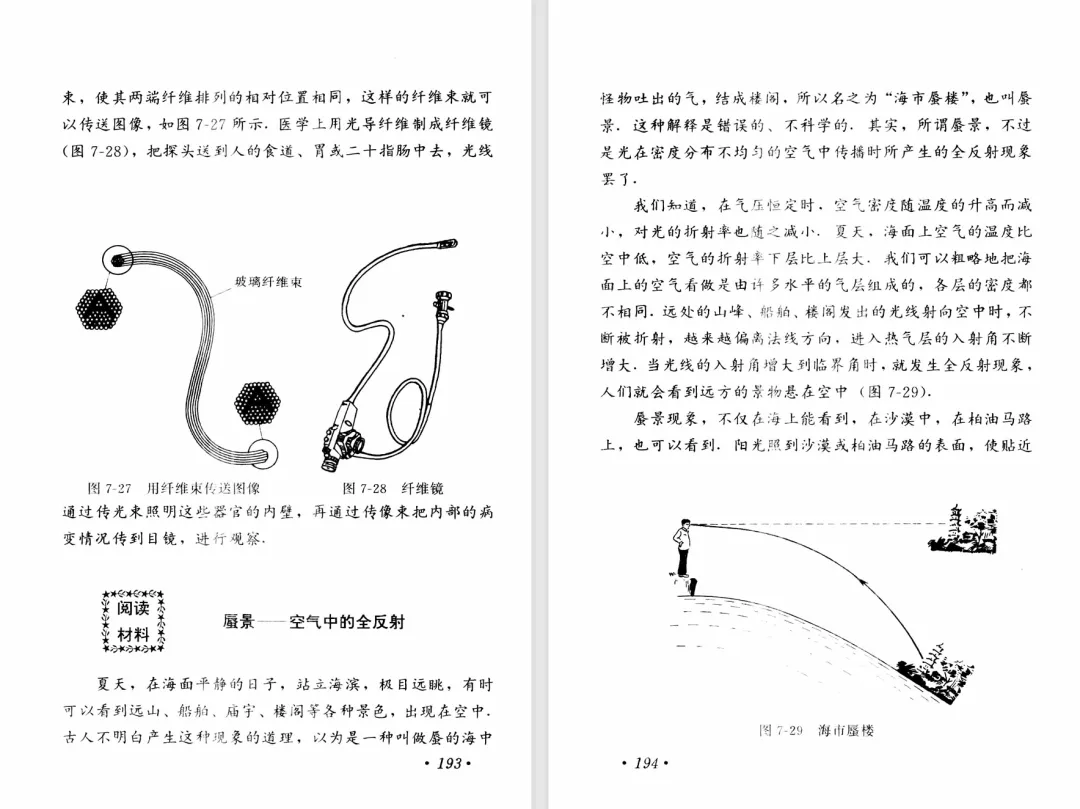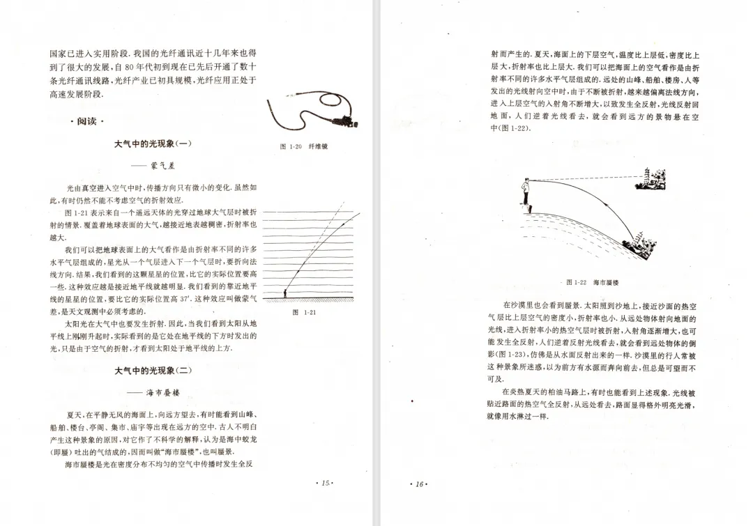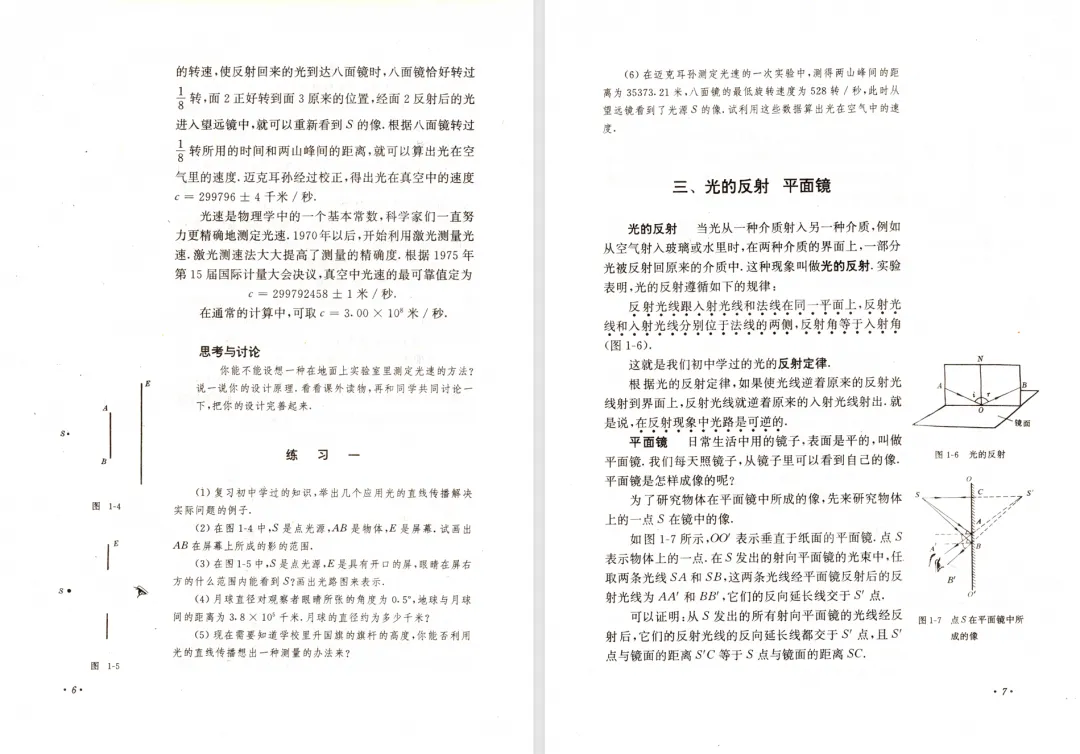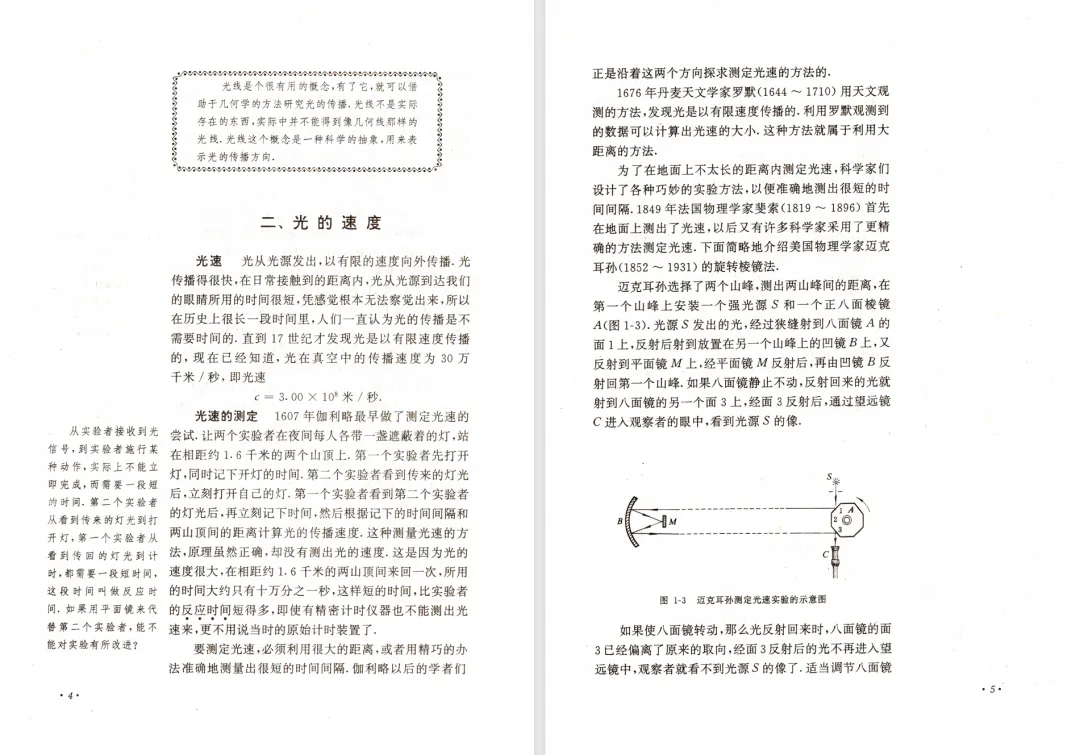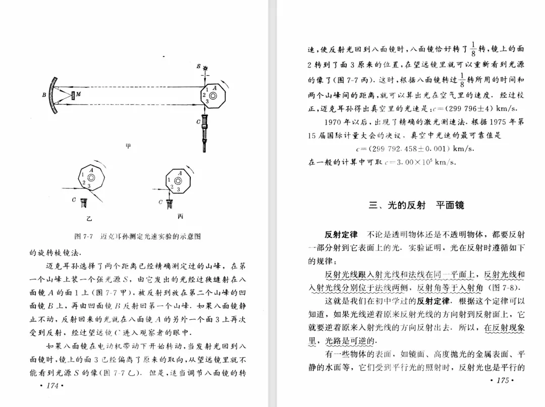 乙种本和九十年代高中物理主要是多了影的内容。而且在介绍光速的测定时,图更多。需要指出的是,连续多个版本的教材对于迈克耳孙测定光速的实验介绍都是不完备的。根据八面镜转过1/8所用的时间和两个山峰间的距离计算光速,是直接拿后者除以前者吗?距离答案仅仅一步之遥,阅读材料就是不说。你说可气不可气!