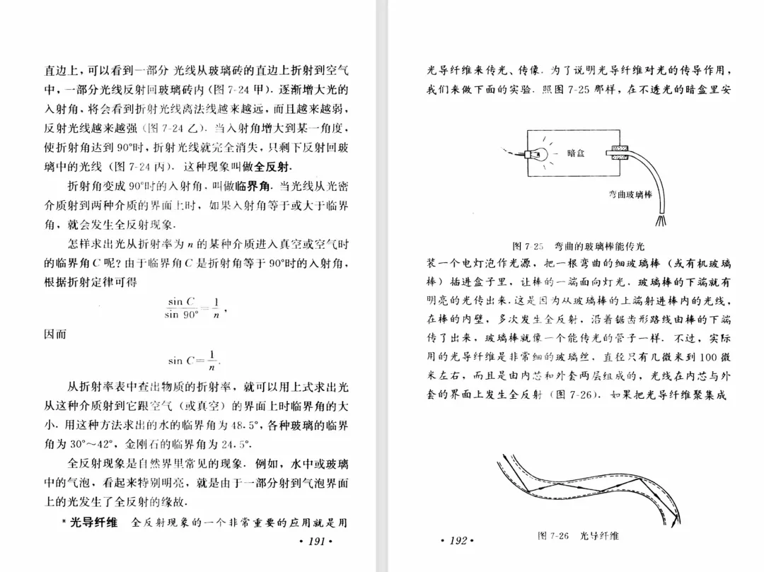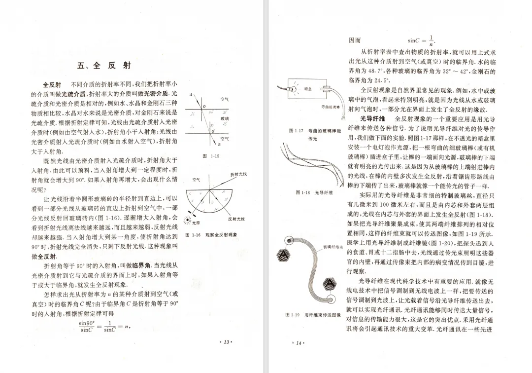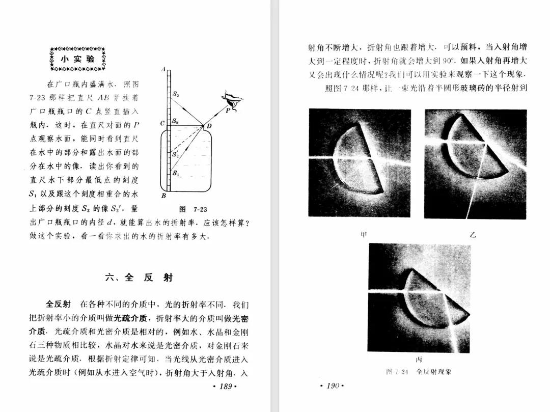 仅仅从这两个几何光学的小节内容即可看出,这套高中物理试验课本的内容更倾向于从甲种本中选取,尽管某些情况下乙种本和九十年代高中物理的内容更详细。全反射是又一个例子。下面是这套实验教材的全反射小节,这节内容更接近甲种本。