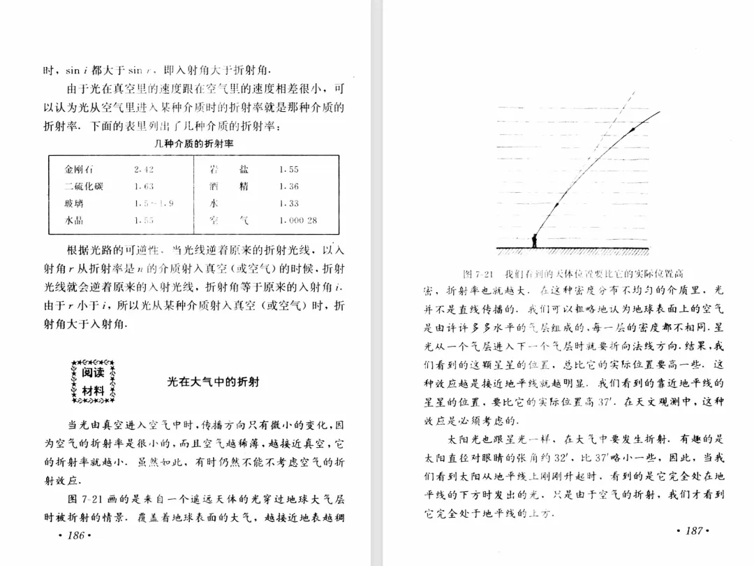 在更早的折射小节末尾,有介绍光在大气中的折射的阅读材料,这个阅读材料在这套实验课本中改名为蒙气差。