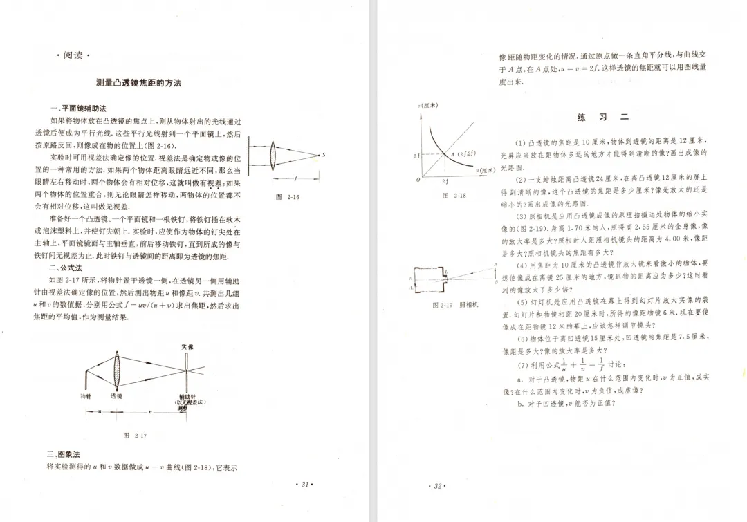 本节末尾增加了一个阅读介绍测量凸透镜焦距的方法。但是,本册测量凸透镜焦距的学生实验使用的不是这里介绍的方法。高中物理乙种本和九十年代高中物理在透镜公式小节介绍完像的放大率后有一个例题,这道例题在这套教材中放到了下图中的练习二第(3)题。