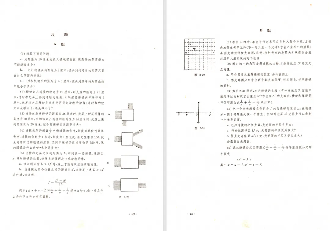 与高中物理乙种本和九十年代高中物理类似,学生实验中用到的测量透镜焦距的方法出现在章末习题中。如下图所示的第(5)题。