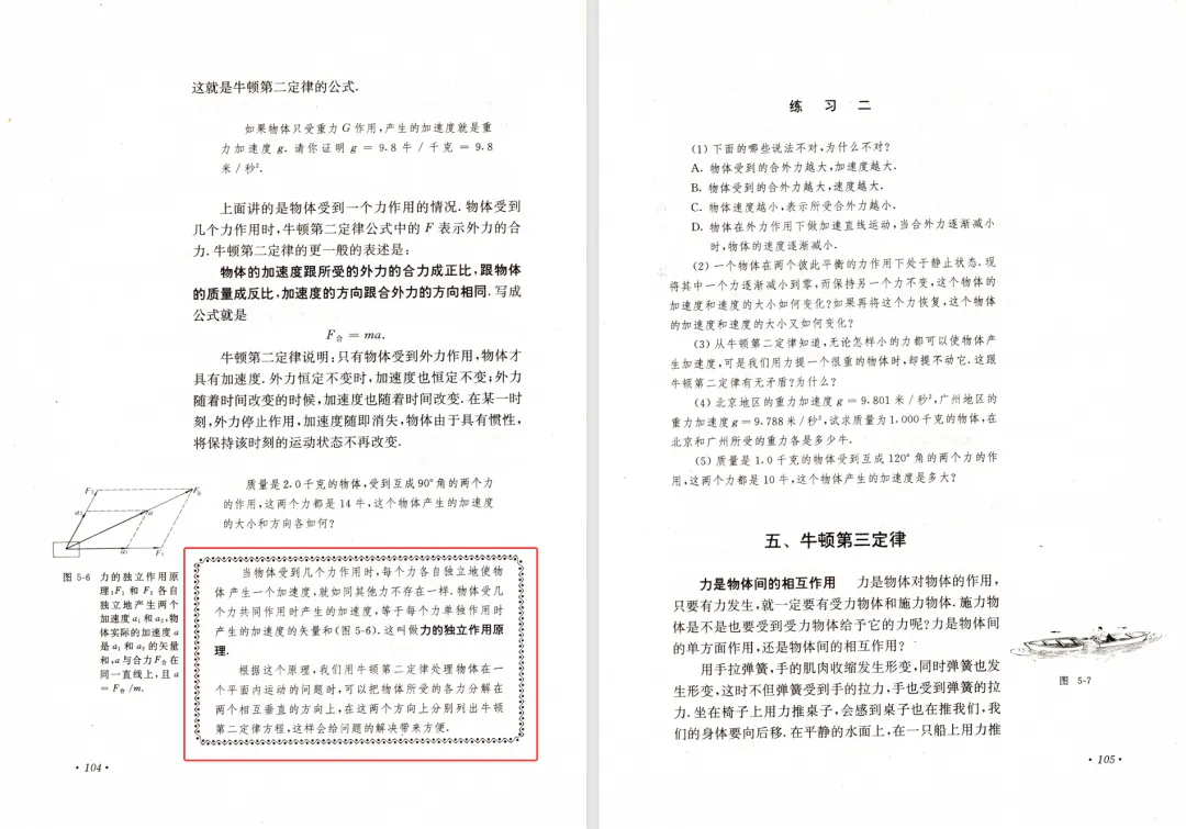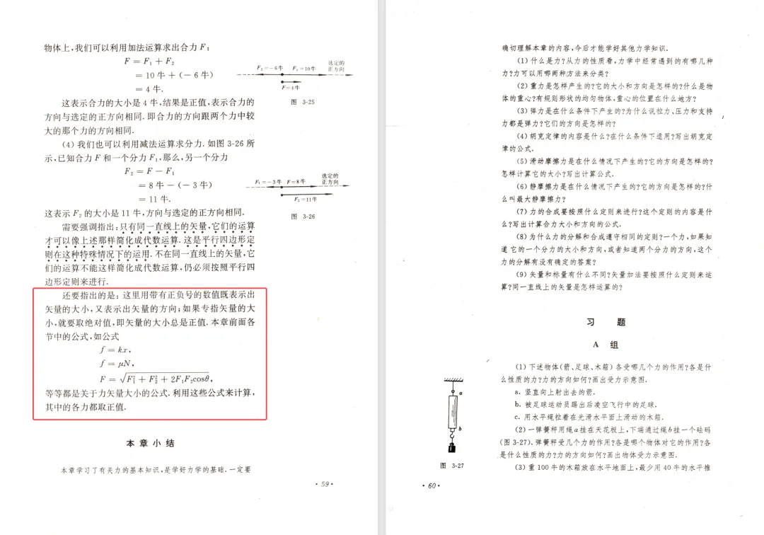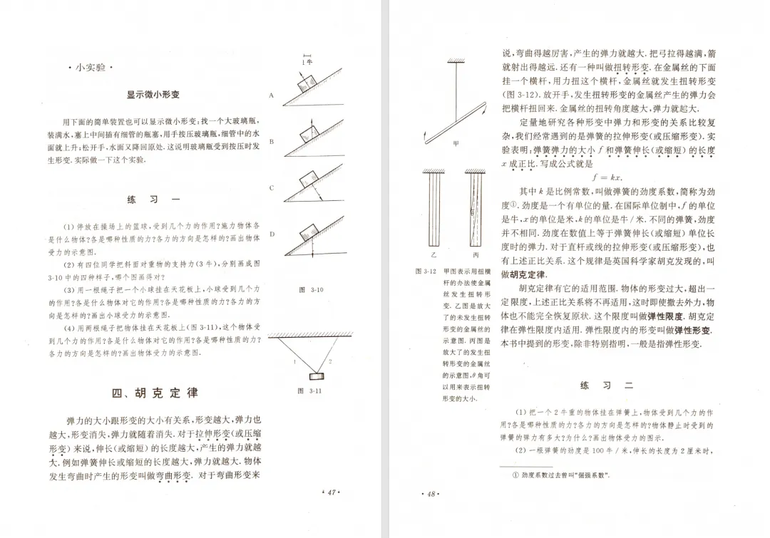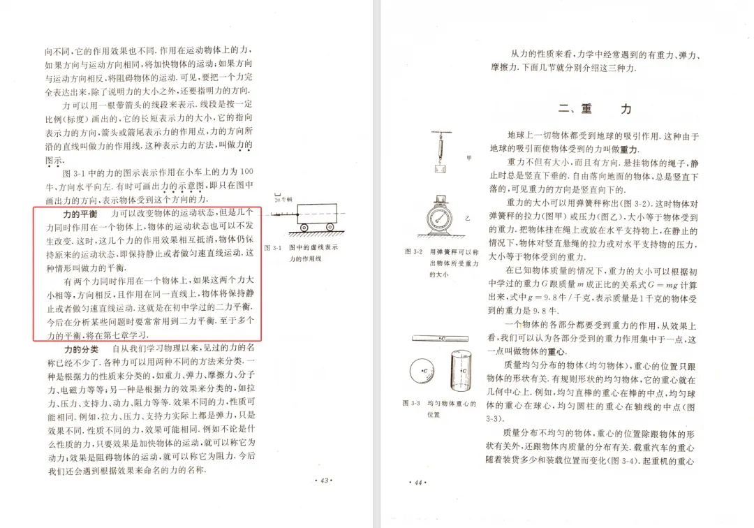 本节新增了力的平衡小标题,见下图红框的部分。对于九十年代以前的高中物理,教材有专门的讲物体的平衡的小节,这个小标题的内容是否存在并不重要。但是九十年代高中物理非常诡异地删除了物体的平衡,即使出版过第二版进行了修订,也没有对物体的平衡进行补充。如果能够像这套教材这样,在开篇第一节简单回顾一下二力平衡,也好过没有。红框内最后一句话还对教材后面介绍多力平衡做了铺垫。