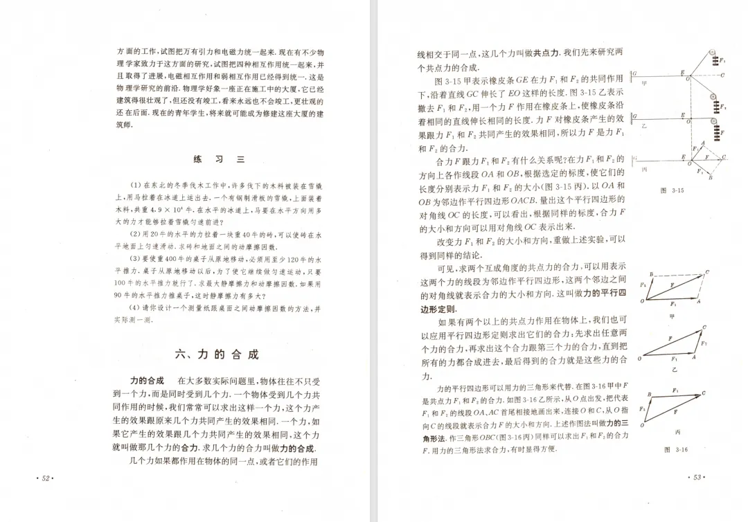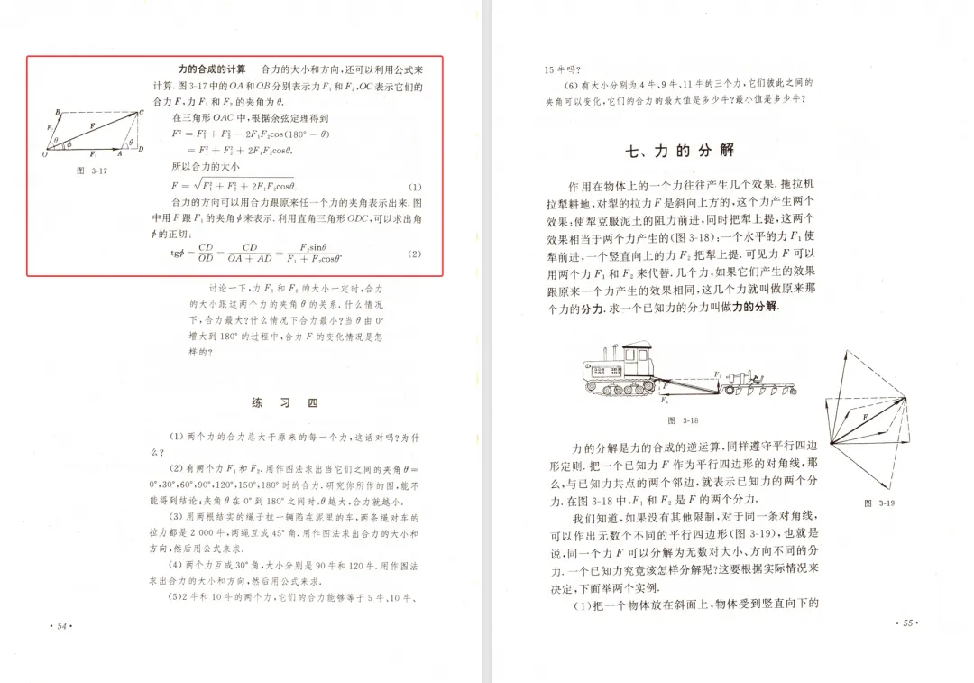本节给出了不共线的力的合成的计算,需要用到余弦定理。这套教材使用初期,余弦定理还是初中数学的内容。1996年读高一的学生,到高一才学习余弦定理。