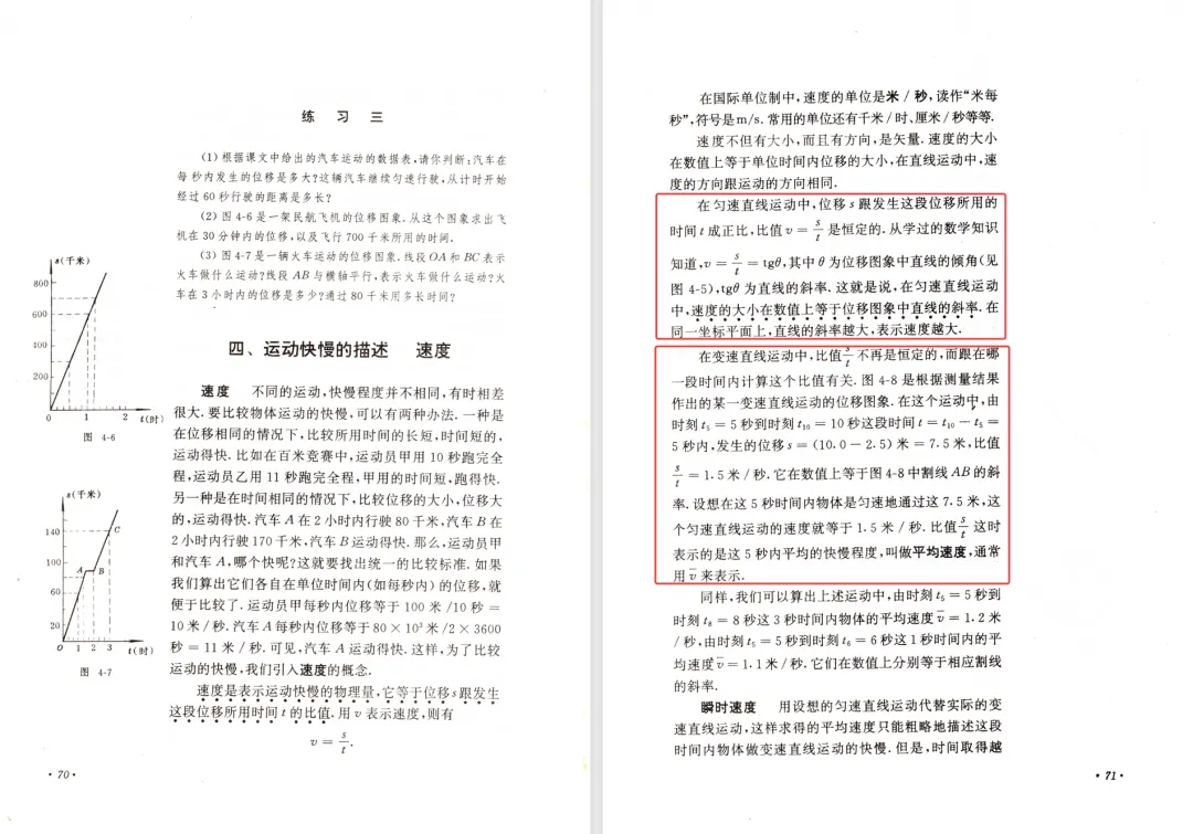 第四节介绍速度的概念。下图红框的两个自然段分别介绍了匀速直线运动和变速直线运动中的速度。介绍匀速直线运动的方法与甲种本类似,使用了斜率的概念。介绍变速直线运动平均速度的方法,甚至是采用了十年制高中物理中采用过的割线定义法。