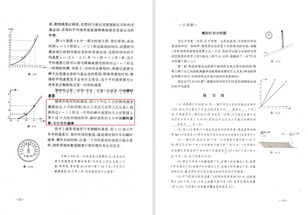 接下来介绍瞬时速度的方法,是与十年制高中物理相同的从割线演变到切线的方法,注意下图第72页红框的段落。红框段落后,是乙种本和十年制高中物理介绍瞬时速度的方法。