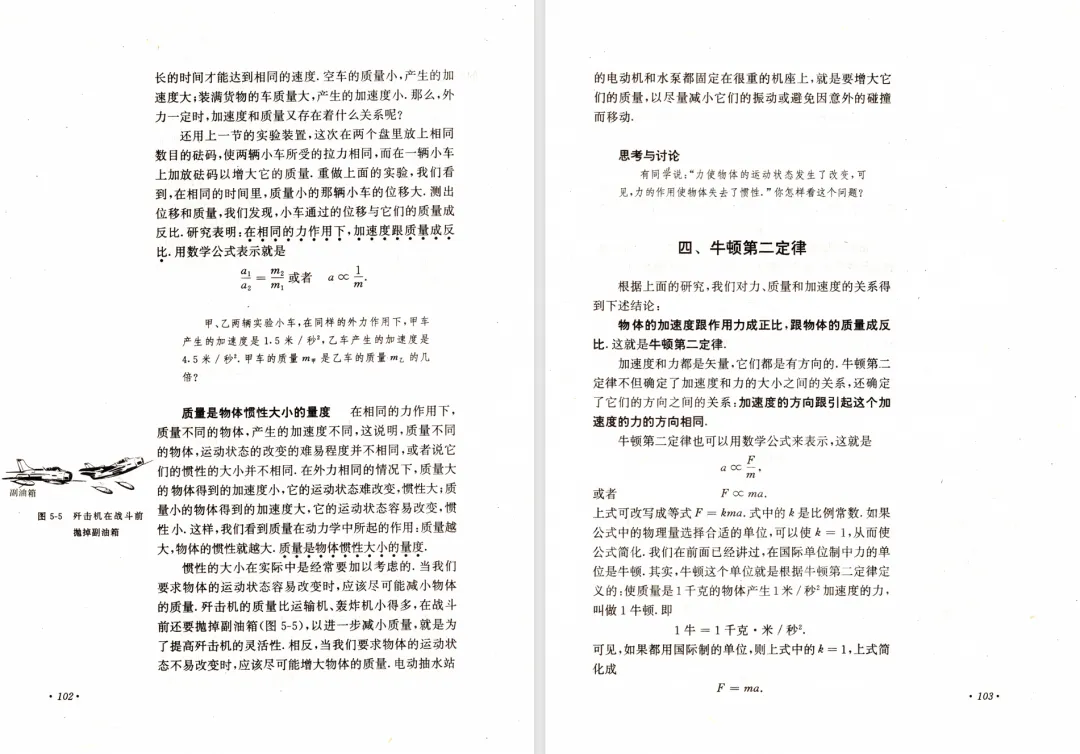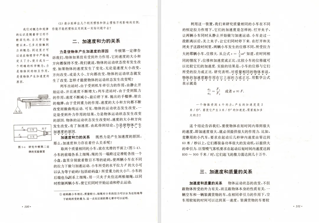 本章对于牛顿第二定律的介绍,恢复了甲种本的方法,即采用两个小节分别介绍加速度和力的关系,以及加速度和质量的关系,最后再用一个新的小节给出牛顿第二定律。