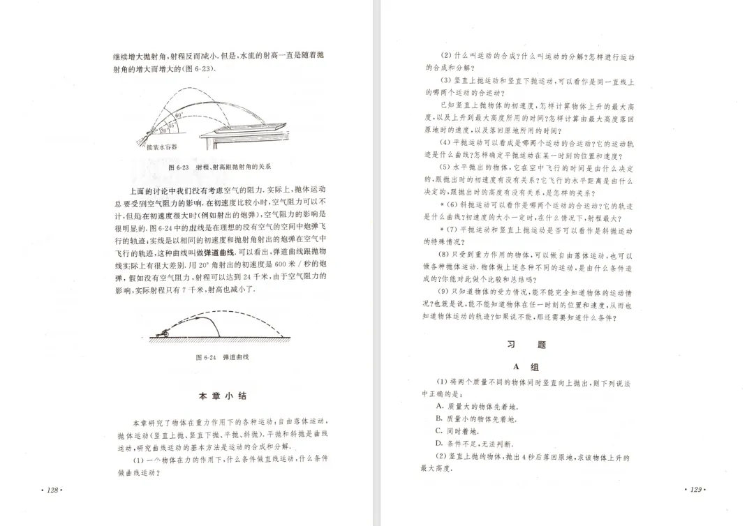 尽管这套教材在不少重要的知识点的介绍上与甲种本接近,例如,加回了利用极限法和面积法推导匀变速直线运动的位移,加回了向心加速度公式的推导,加回了小幅单摆是简谐运动的推导,但是这套教材并没有把甲种本的内容都囊括进来。例如,有关物体的平衡的内容,这套教材就没有力偶、平衡的种类、稳度,后两者甚至在乙种本是有的,这套教材也没有进行补充。又如,斜抛运动没有像甲种本那样给出运动公式、射高和射程公式。
