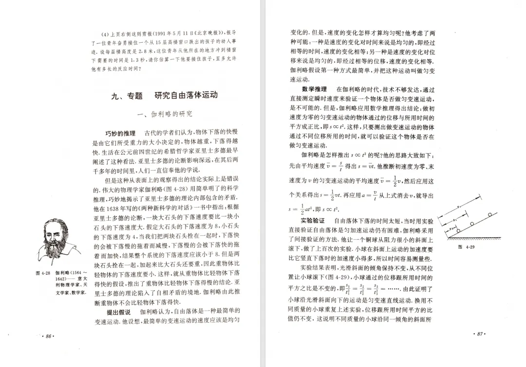 )的介绍,专题要求学生应用已学习的知识综合分析,解决实际问题。但是,研究自由落体运动的这个专题,在这些方面体现得不够充分。本专题第一部分先回顾了伽利略的研究,这些内容在以往的教材中放在阅读材料。