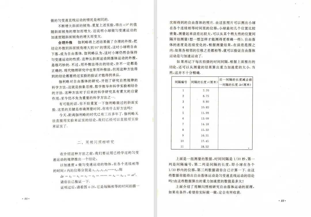 在第二部分,介绍用频闪照相研究自由落体运动。这部分核心内容是开头给出的结论:自由落体运动相邻的相等时间内通过的位移差是定值。