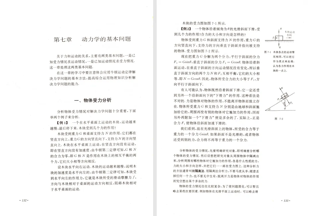 第一节通过例题介绍物体受力分析的方法。下图第133页最后两个自然段字体更小,属于提高性质的内容。里面提到了受力分析的隔离法。但是,教材却没有给出使用隔离法进行受力分析的实例,内容不够完整。