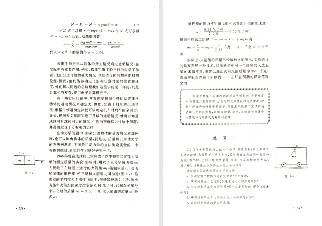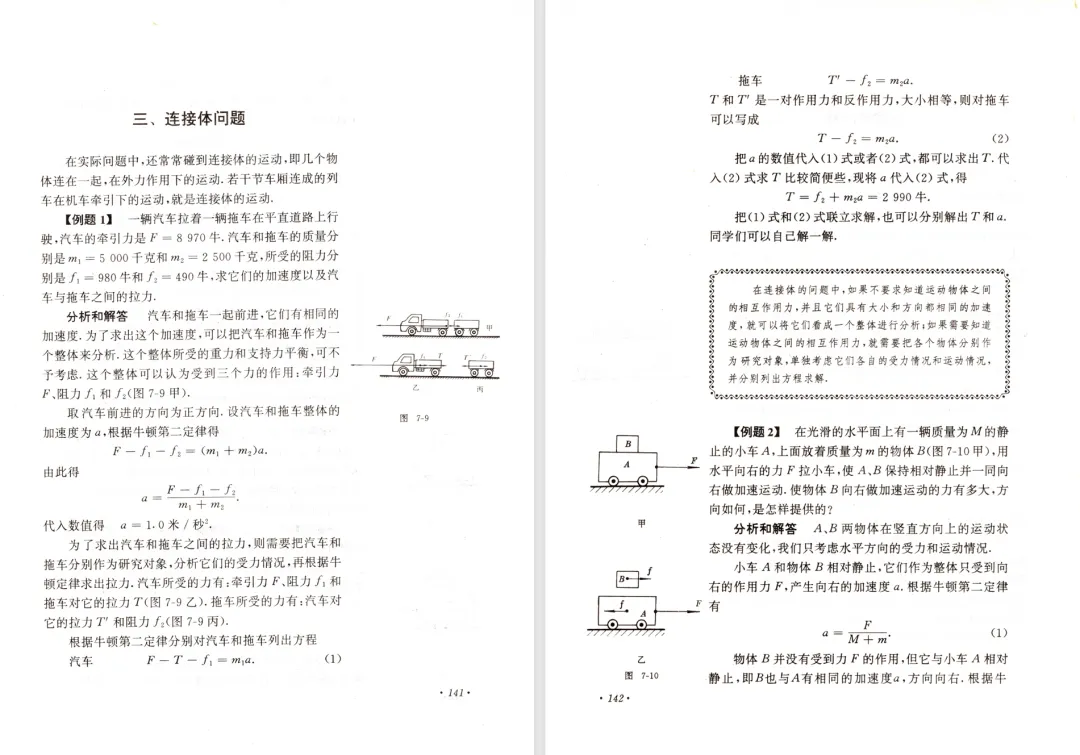九十年代高中物理选修第一章 第五节 牛顿运动定律的应用(二)。连接体的受力分析需要根据具体情况,灵活选择整体法和隔离法进行。这又弥补了第一节没有隔离法受力分析例题的不足。