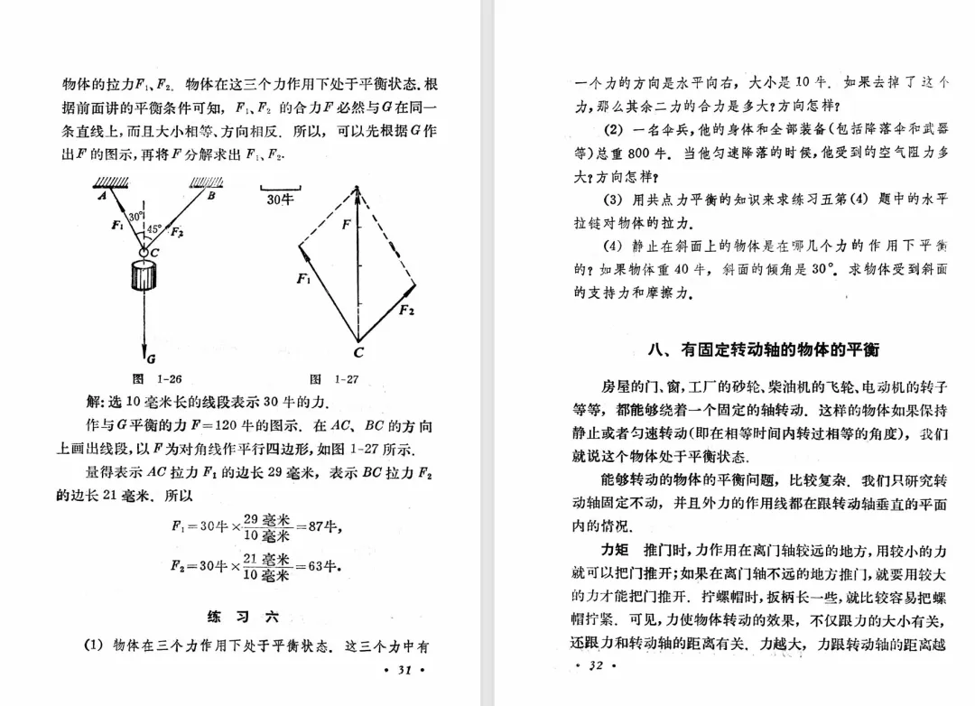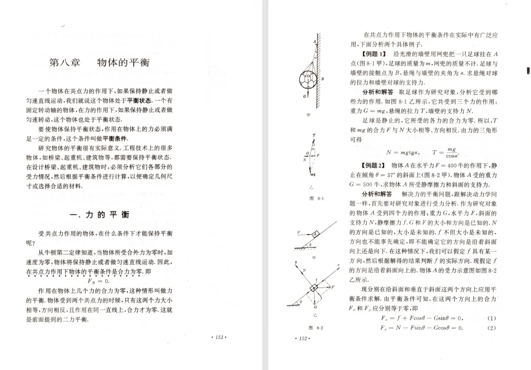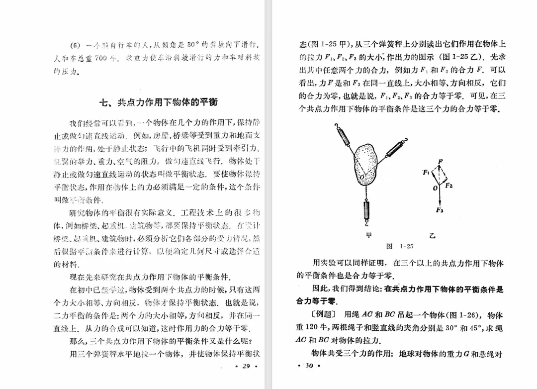 甲种本和乙种本对于共点力作用下物体的平衡的介绍都没有这套教材丰富。下面是甲种本的小节,没有例题。