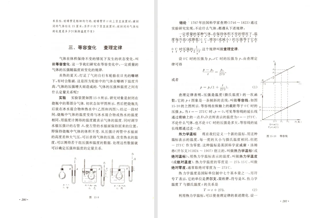 这套教材把热力学温标融合到了查理定律的小节,没有单独成节。这里需要指出,这套教材小节的颗粒度更大,倾向于融合内容。而以往的教材,如甲种本,小节的颗粒度较小,同一个知识点的内容甚至会拆分成多个小节。