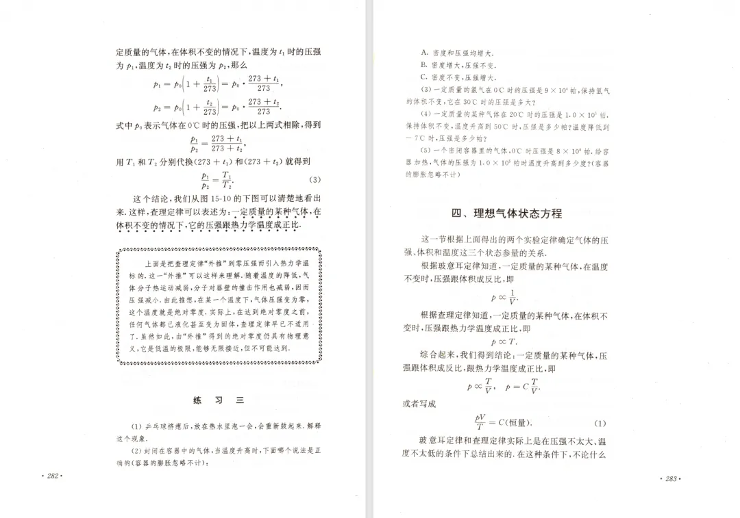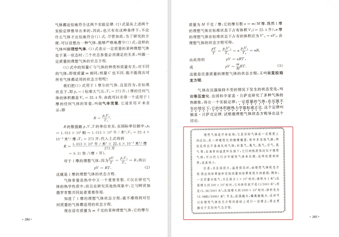 上图第283页后半段开始介绍理想气体状态方程,先通过比例式得出pV/T等于恒量,在下图继续推导给出克拉珀龙方程。这套教材对于等压变化和盖吕萨克定律也只是做了很简单的介绍。本节末尾对理想气体和理想气体状态方程的应用范围给出进一步解释,如下图红框所示。
