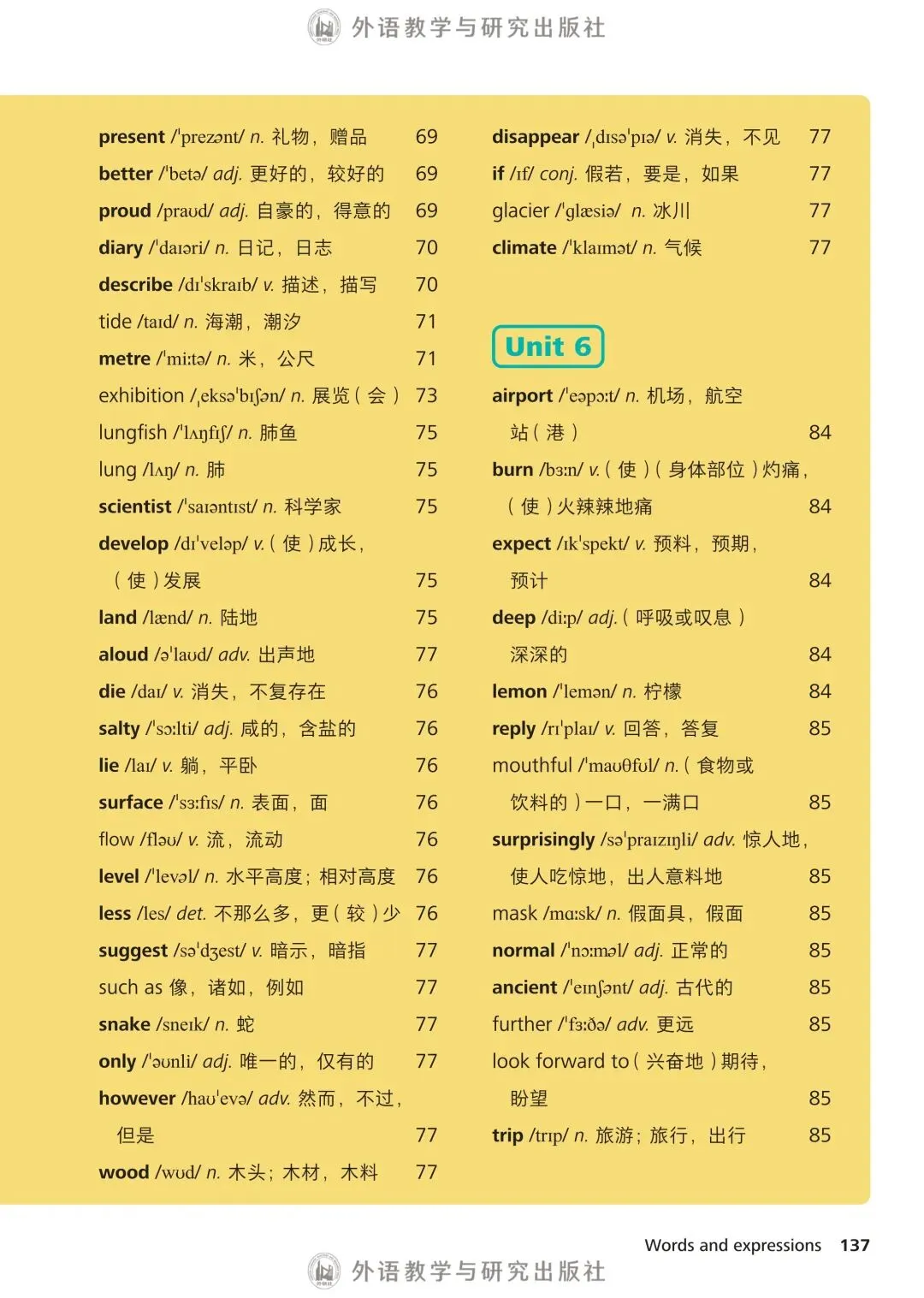 1、direction /dəˈrekʃn/ n. 方向2、turn left /tɜːn/ phr. 向左转3、turn right /raɪt/ phr. 向右转4、across /əˈkrɒs/ prep. 穿过5、between /bɪˈtwiːn/ prep. 在之间6、next to phr. 紧挨着7、market /ˈmɑːkɪt/ n. 市场8、bank /bæŋk/ n. 银行9、restaurant /ˈrestrɒnt/ n. 餐馆10、hospital /ˈhɒspɪtl/ n. 医院11、police station phr. 警察局12、weather /ˈweðə(r)/ n. 天气13、sunny /ˈsʌni/ adj. 晴朗的14、rainy /ˈreɪni/ adj. 多雨的15、cloudy /ˈklaʊdi/ adj. 多云的16、windy /ˈwɪndi/ adj. 有风的17、season /ˈsiːzn/ n. 季节18、spring /sprɪŋ/ n. 春天19、summer /ˈsʌmə(r)/ n. 夏天20、autumn /ˈɔːtəm/ n. 秋天21、winter /ˈwɪntə(r)/ n. 冬天22、travel /ˈtrævl/ v. 旅行23、journey /ˈdʒɜːni/ n. 旅行24、ticket /ˈtɪkɪt/ n. 票25、station /ˈsteɪʃn/ n. 车站26、arrive /əˈraɪv/ v. 到达27、leave /liːv/ v. 离开28、wait for phr. 等待29、enjoy /ɪnˈdʒɔɪ/ v. 喜欢30、take a walk phr. 散步